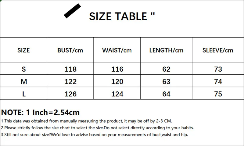 La Tabla de tallas es la siguiente, elija según el tamaño de su cuerpo. Hay un margen de error de 1-2cm, si no está seguro del tamaño, envíeme la información de su altura, peso y cintura, le ayudaré a elegir la talla correcta.
