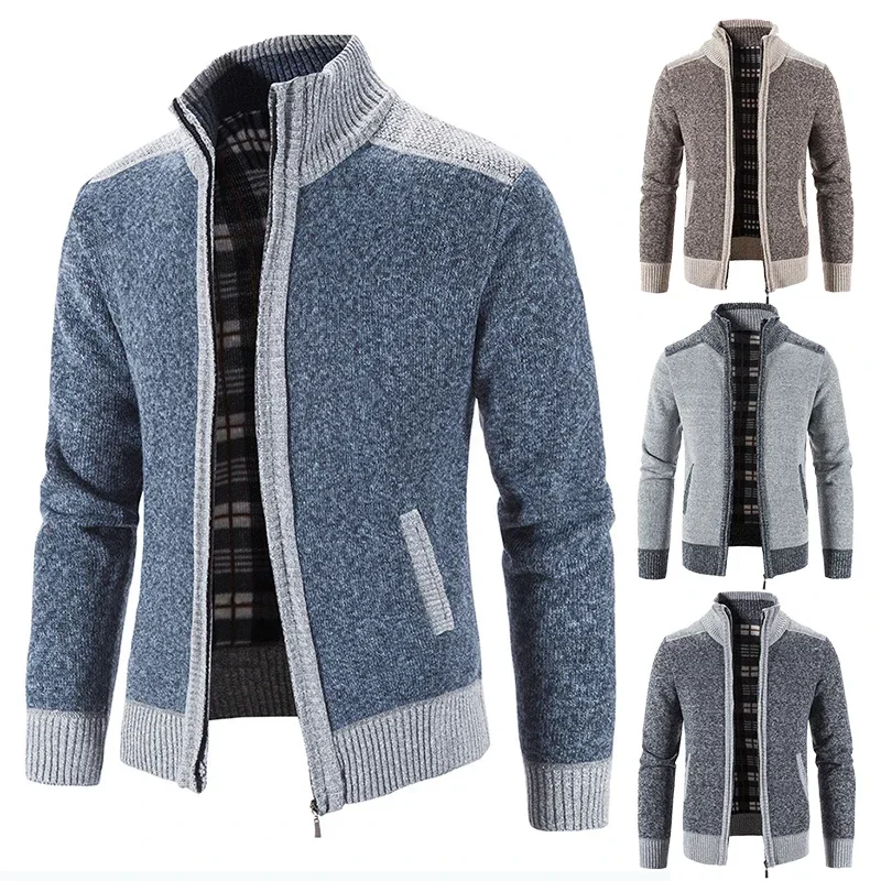 Men's Warm Zipper Sweater Coat Fashion Patchwork Cardigan Male Knitted Sweater Jacket Slim Fit Stand Collar Thick Warm Coats