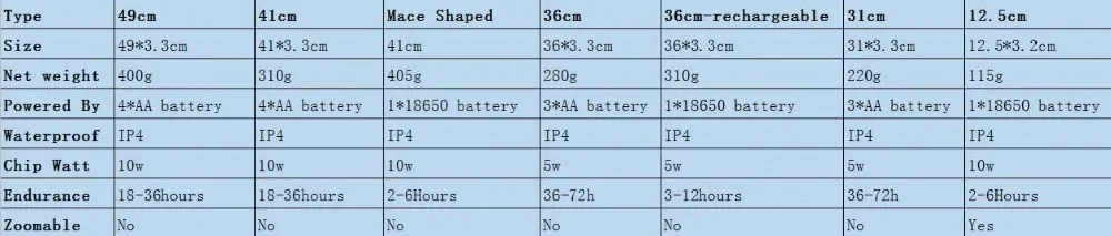 Nota: El paquete no incluye batería ni cargador. Modelo de producto: linterna de bate de béisbol Material del producto: aleación de aluminio. Tamaño del producto: 49 cm, 41 cm, 36 cm, 31 cm, 12,5 cm Modelo de cuenta de lámpara: Perla de lámpara XML-T6 deslumbrante Modo de enfoque: sin enfoque Lúmenes de fuente de luz: 220-380LM Batería aplicable: 41 ~ 49 CM ,4 * pilas AA / 31~36 CM ,3 * pilas AA / 36 Modelo CM 18650 ,1*18650 batería. Voltaje de funcionamiento: 3,7 V Peso neto del producto: 49 cm-360 g, 41 cm-300 g, 36 cm-230 g, 31 cm-200 g, 12,5 cm-115 g Función del producto: Autodefensa al aire libre, autodefensa anti-río, seguridad de emergencia, esencial para conducir sin conductor.