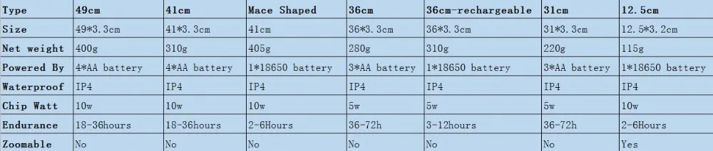Nota: El paquete no incluye batería ni cargador Modelo del producto: linterna de bate de béisbol Material del producto: aleación de aluminio Tamaño del producto: 49cm, 41cm, 36cm, 31cm, 12,5 cm Modelo de cuenta de lámpara: cuenta de lámpara Glare Modo de enfoque: sin enfoque Lúmenes de fuente de luz: 220-380LM Batería aplicable: 41 ~ 49cm , 4 pilas AA/ 31~36 Cm , 3 pilas AA/ 36 Modelo CM 18650 , 1*18650 batería. Voltaje de funcionamiento: 3,7 V Peso neto del producto: 49cm-360g, 41cm-300g, 36cm-230G, 31cm-200g, 12,5 cm-115g Función del producto: Autodefensa al aire libre, autodefensa antidisturbios, seguridad de emergencia, autoconducción esencial.
