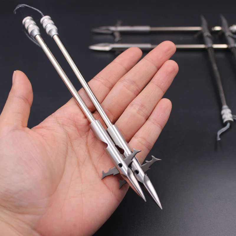 Modo de empleo: fije un sedal al final del dardo, lleve el tirachinas/arco con usted y podrá ir a pescar.