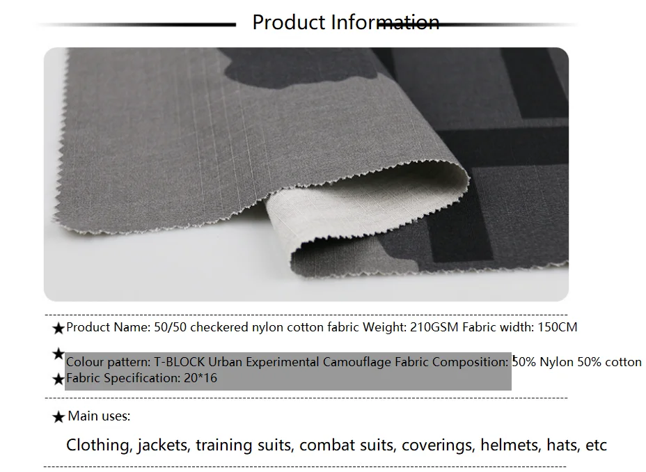Usos principales: Ropa, chaquetas, uniformes de entrenamiento, trajes de combate, monos, cascos, gorros, etc.