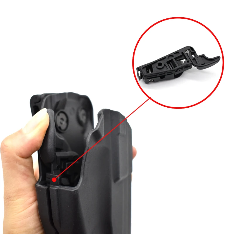 -Grip Lock System asegura el arma una vez funda; La retención se desactiva con el dedo medio sobre un agarre de disparo estándar en el arma.