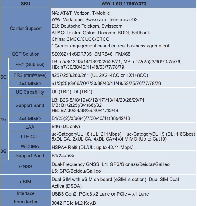 T99W373 está diseñado para permitir la conectividad de datos inalámbrica para computadoras portátiles o cualquier otro dispositivo compatible con la ranura PCI Express M.2 tipo 3042 Key B. T99W373 es la solución de tarjeta de datos que ofrece conectividad de red inalámbrica de área amplia (WWAN) para los protocolos 5GNR (Sub 6G/ mmWave), LTE, UMTS (HSDPA/HSUPA/HSPA DC-HSPA) y GPS/Glonass/Beidou/ Galileo en una configuración de hardware.