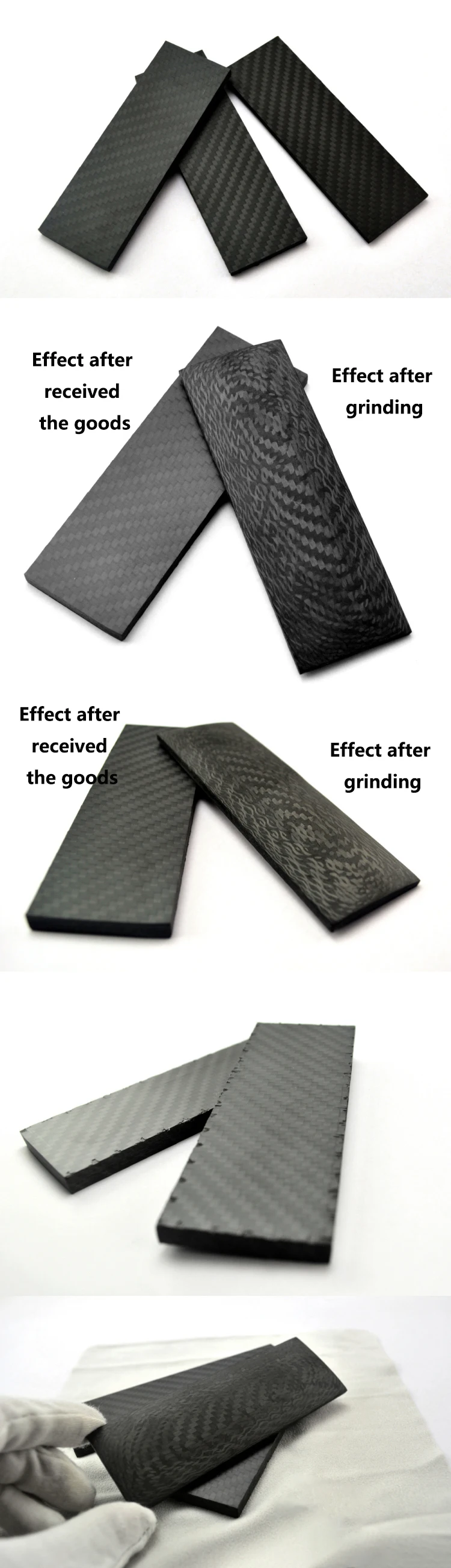 2. El mango completo de fibra de carbono 3K está hecho de material Full 3K en cada capa, NO 3K en la superficie y tela de carbono en la capa intermedia. Este material está personalizado para el mango del cuchillo.