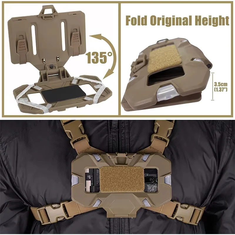 Tabla de navegación plegable y liviana con soporte en un chaleco táctico o arnés de soporte para teléfono.