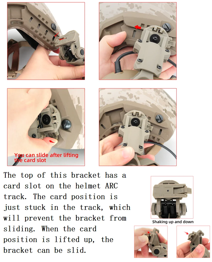 Este adaptador de riel para casco ARC puede girar 360° y puede moverse hacia arriba y hacia abajo.La posición de la tarjeta del soporte del auricular también se puede girar.La longitud del soporte también se puede ajustar.