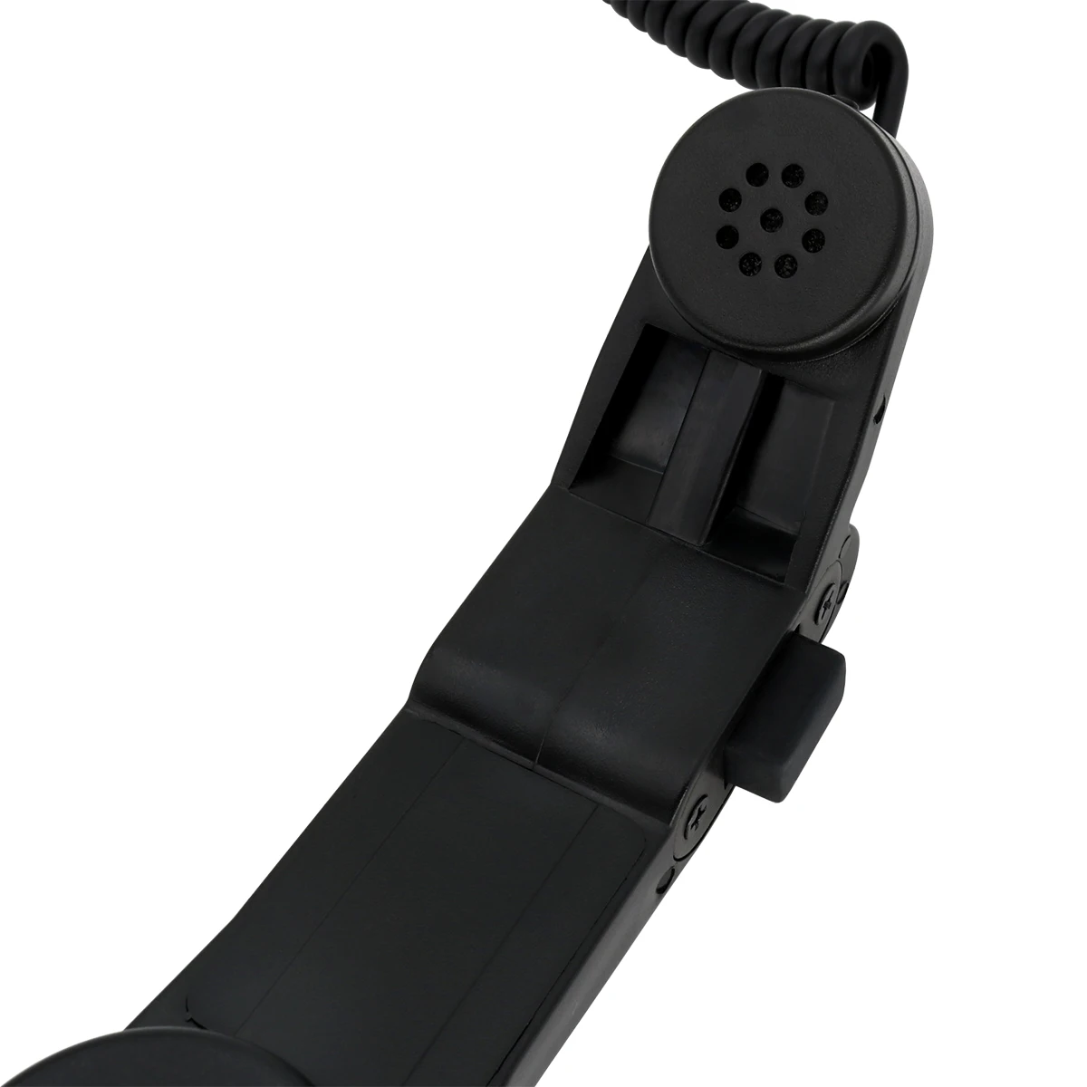 El PTT de mano se puede colgar en la tela a través del gancho en la parte posterior.
