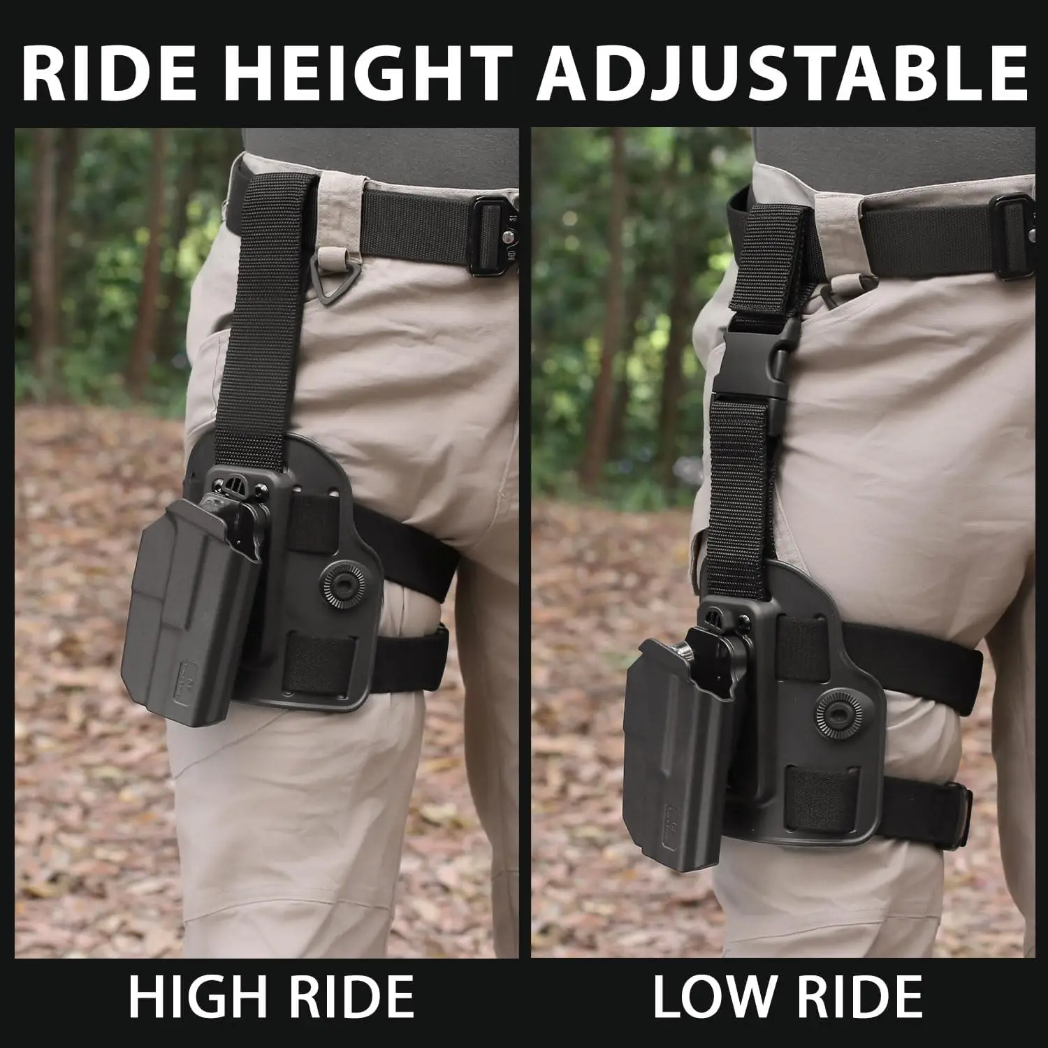 2. RETENCIÓN NIVEL II: esta funda para muslo ofrece retención de nivel II. Puede llevar esta funda para pierna caída a su pierna derecha y usar la funda con liberación del pulgar de la mano derecha según sus preferencias.Esta funda puede darle acceso exclusivo a sus pistolas y evitar que otras tomen su arma.