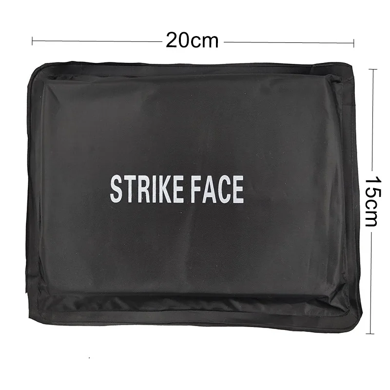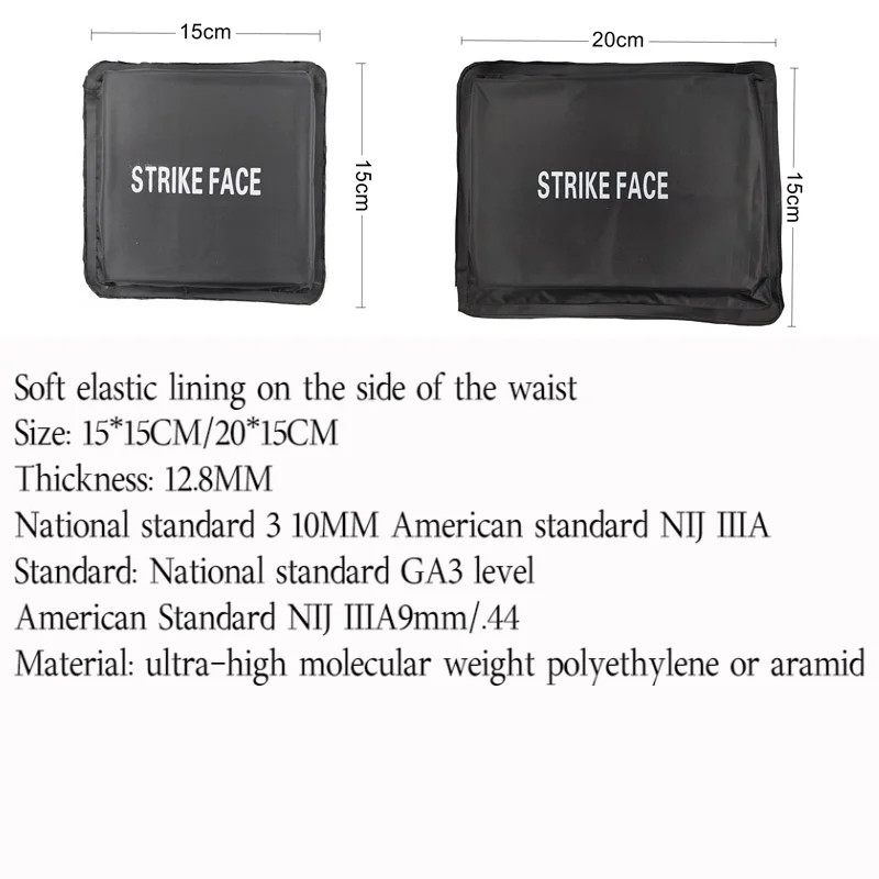 Placa de inserción suave a prueba de balas en la cintura. El tamaño de este inserto es de 15*15cm o 20*15cm. El grosor es de aproximadamente 15mm. El relleno interior es a prueba de puñaladas con 21 capas de fieltro PE a prueba de puñaladas y 3 capas de lámina impregnada a prueba de puñaladas. El revestimiento antibalas es de 42 capas de lámina balística de PE o 38 capas de aramida importada.