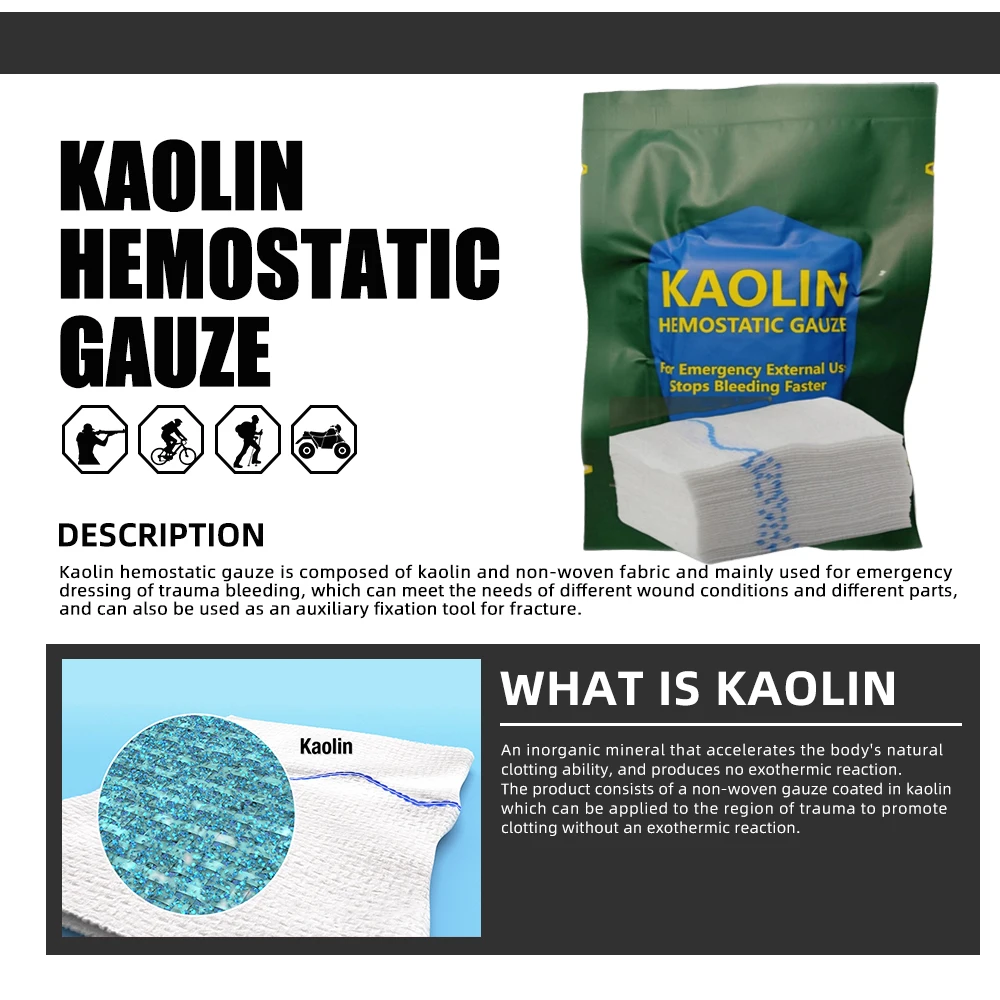 La gasa hemostática para caolín se compone de caolín y tela no tejida y se utiliza principalmente para el tratamiento de emergencia de sangrado de traumatismos, que puede satisfacer las necesidades de diferentes condiciones de herida y diferentes partes y también se puede utilizar como herramienta de fijación auxiliar para fracturas.