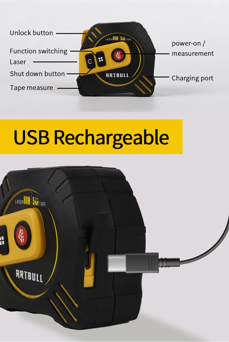 Telémetro láser multifunción 2 en 1, cinta métrica recargable de 80m, 40m, 5m, pantalla LCD con retroiluminación