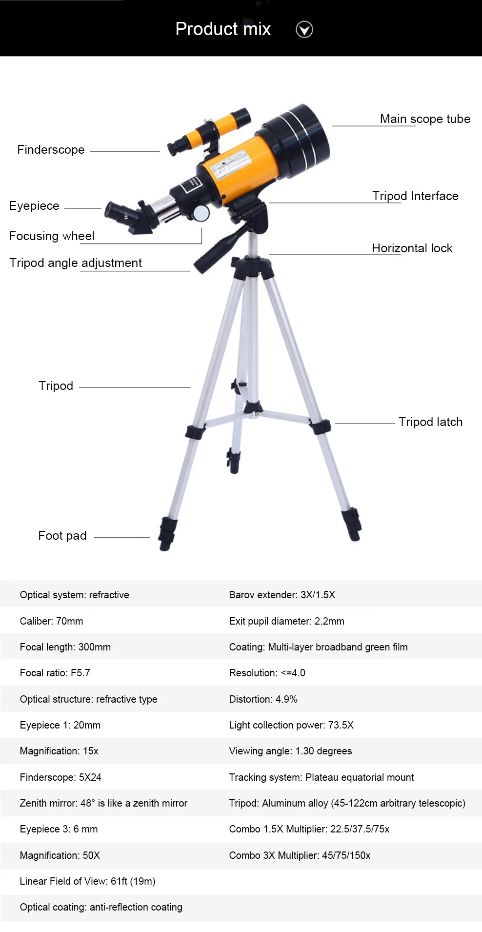 F30070M Telescopio astronómico profesional Zoom 150 veces HD trípode portátil de alta potencia visión nocturna vista estrella luna
