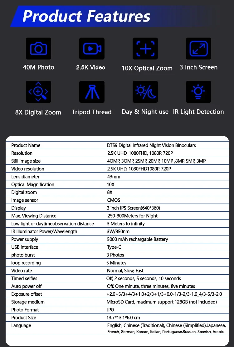 P: ¿Cuáles son las características clave de la cámara binocular de visión nocturna digital DT59?