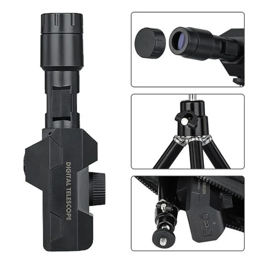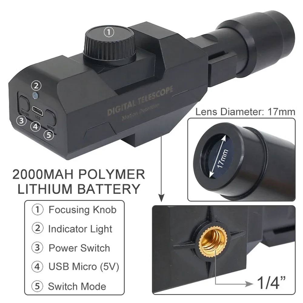 Este telescopio tiene a lente de objetivo grande, cuanto mayor sea el calibre de la lente del objetivo, más luz entran en la imagen, imagen más nítida, más clara la vista y más rico el detalle visto.La aplicación de control del móvil telefónico es disponible para los sistemas Android and IOS, y admite toma de fotografías, grabación de videos, detección y control de movimiento, localización cruzada, observación de cuatro vías y funciones de comparación de pantalla.Viene con telescópico tripode, orientación de transferencia y soporte que se puede quitar.