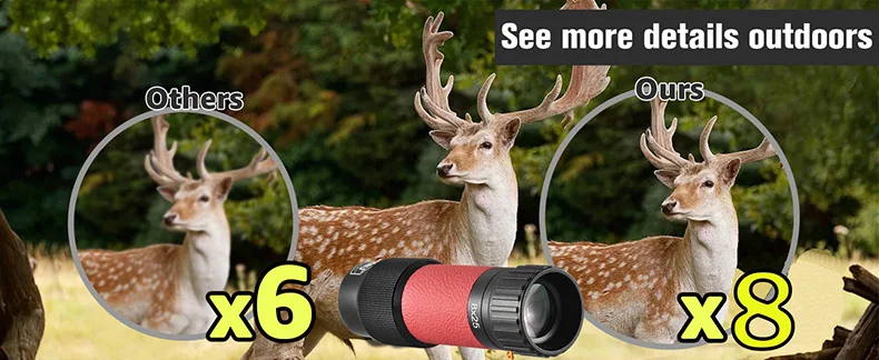 【Visión amplia y estable】 8x es un aumento ideal para el telescopio portátil, equilibra perfectamente el efecto de zoom y la estabilidad de la imagen.El amplio campo de visión (32FT@1000YDS) ofrece una visualización más cómoda.Por lo tanto, el monocular de bolsillo puede atrapar en gran medida objetos cercanos y rápidos como animales salvajes.Es un excelente monocular compacto para la caza.No dude en llevar este telescopio monocular compacto y convertirlo en su mejor compañero al aire libre.
