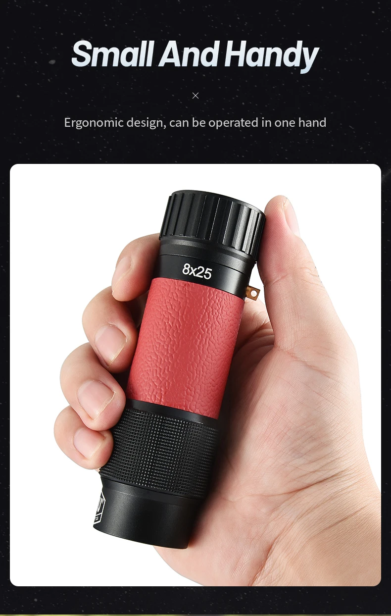 【Diseño monocular compacto y ergonómico】El diseño ergonómico inteligente le permite usarlo fácilmente con una sola mano.Su gran rueda de enfoque permite que el telescopio monocular compacto sea fácil de operar y de usar.El tamaño monocular de bolsillo (4,72 x 1,54 pulgadas) y el peso liviano (6 oz) mejoran efectivamente su portabilidad.Además, ofrecemos accesorios adicionales (incluida la correa de mano y la bolsa) para transportar su mini telescopio de forma más cómoda.