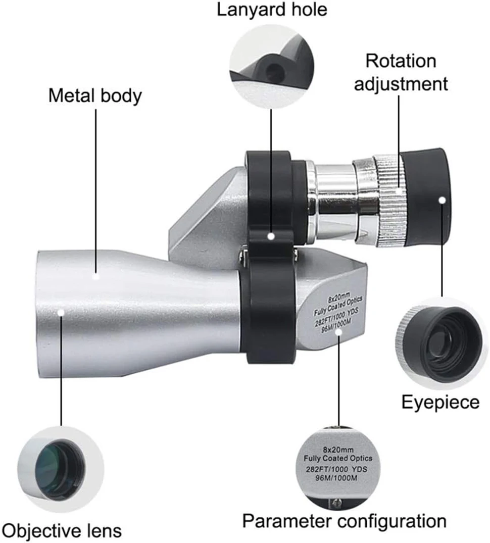 Lente HD: el ocular monocular para adultos y niños está hecho de una película óptica azul transparente de alta definición, la imagen es clara y brillante, por lo que puede ver muy claramente por la noche;Monocular con zoom de 8 x 20 con un ángulo de visión de hasta 8 x y un objetivo de 20 mm para una visión más clara y brillante