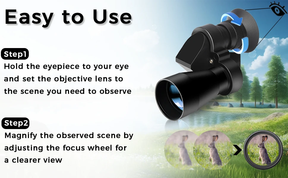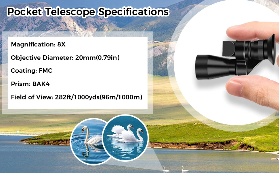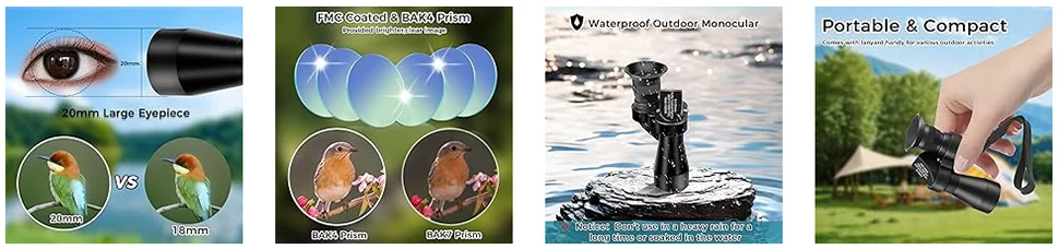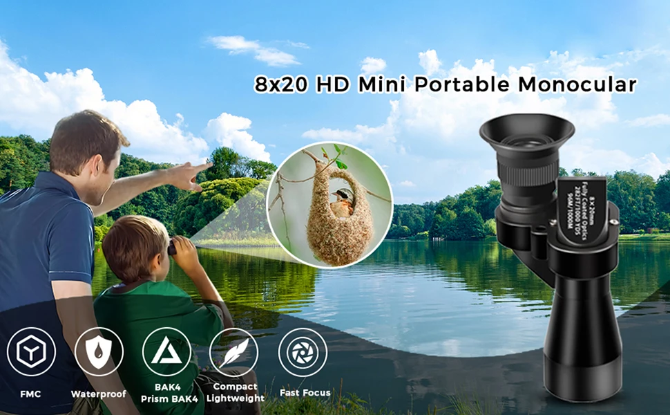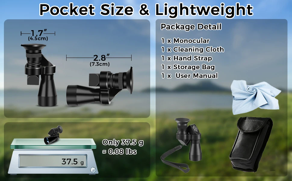 Diseño con una sola mano: Con el tamaño de bolsillo compacto monocular, este telescopio portátil es fácil de usar con una sola mano; Puedes guardarlo en tu bolsillo y llevarlo contigo dondequiera que vayas; El paquete incluye 1 mini monocular, 1 correa para la muñeca, 1 paño protector, 1 bolsa protectora y 1 manual de usuario.