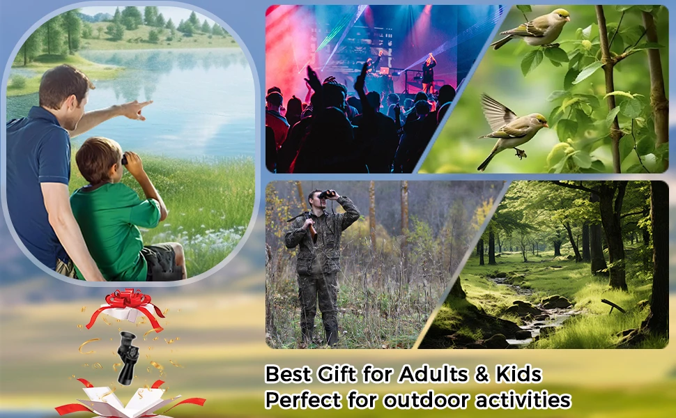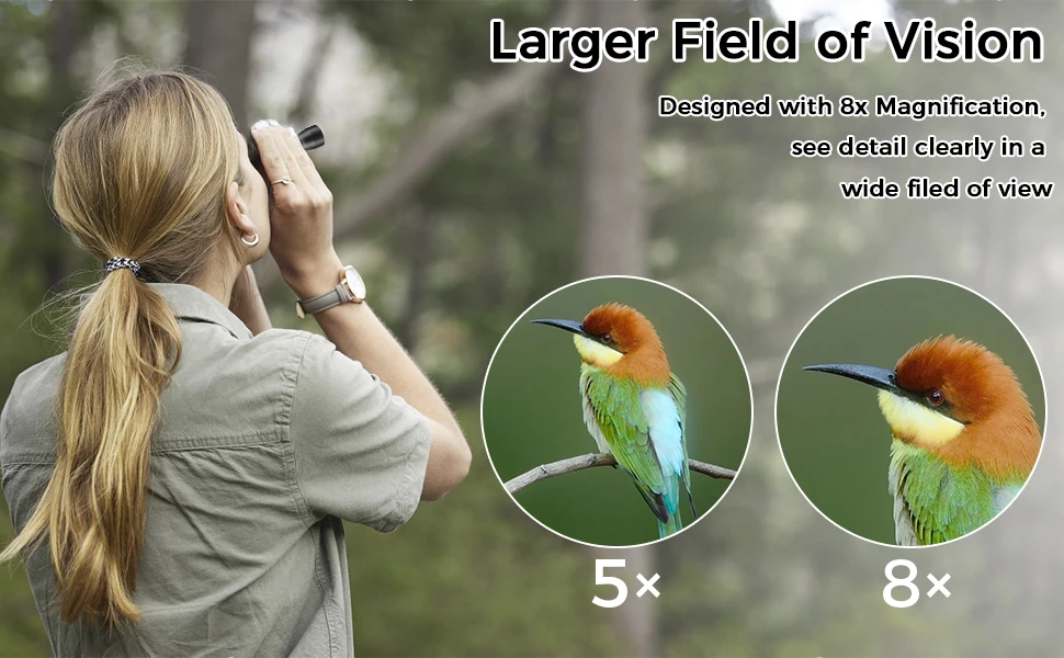 Ampliamente utilizado: este mini telescopio tiene un gran campo de visión; Adecuado para observar aves, conciertos, eventos deportivos, caminatas, campamentos, viajes, observar la naturaleza, paisajes, etc. Campo de visión entre 96 metros y 1000 metros