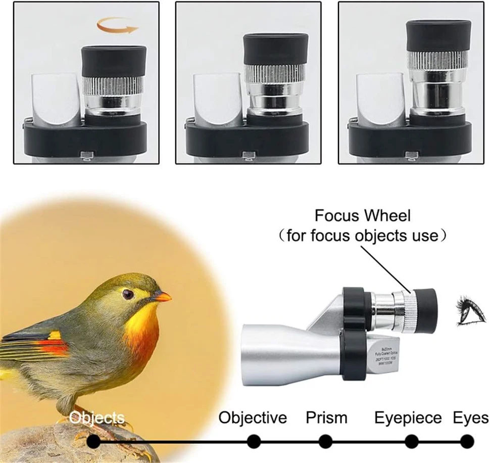 Fácil de usar: la rueda de enfoque del telescopio monocular portátil se puede ajustar fácilmente con una sola mano, que es el monocular para pájaros más fácil de usar;El ocular gira hacia arriba y hacia abajo rápida y fácilmente para una visualización óptima con o sin gafas, lo que permite que su teléfono abrace la naturaleza con mayor claridad.