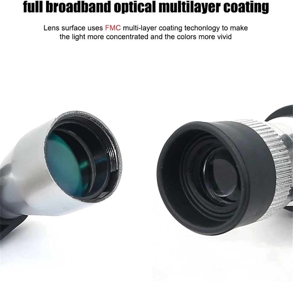 Lente objetivo de 20 mm: el telescopio monocular de mano de bolsillo utiliza un prisma BAK4 de alta gama;Ocular de 12 mm con revestimiento de película verde de banda ancha FMC, puede eliminar eficazmente la dispersión de luz interna del vidrio, reducir la pérdida de luz interna y alta transmitancia, campo de visión más transparente