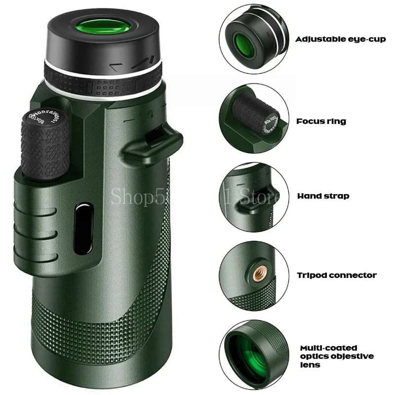 80X100 Hd Monocular Telescope 8000M Long Range Zoom Bak4 Prism Telescope with/without Tripod Phone Clip Hunting Outdoor Camping
