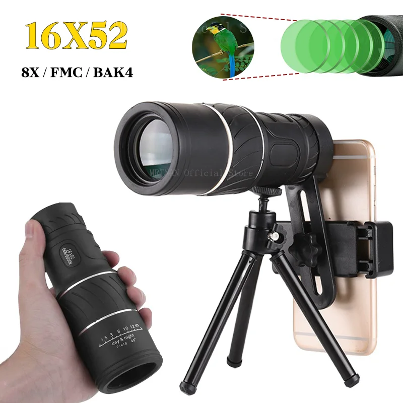 Telescopio Monocular portátil de película verde 16x52 HD, para observación de aves, senderismo, conciertos, fotografía, potente Spyglass de largo alcance
