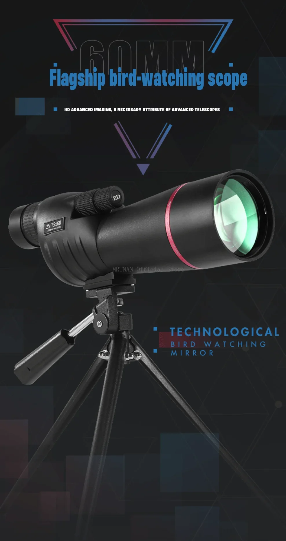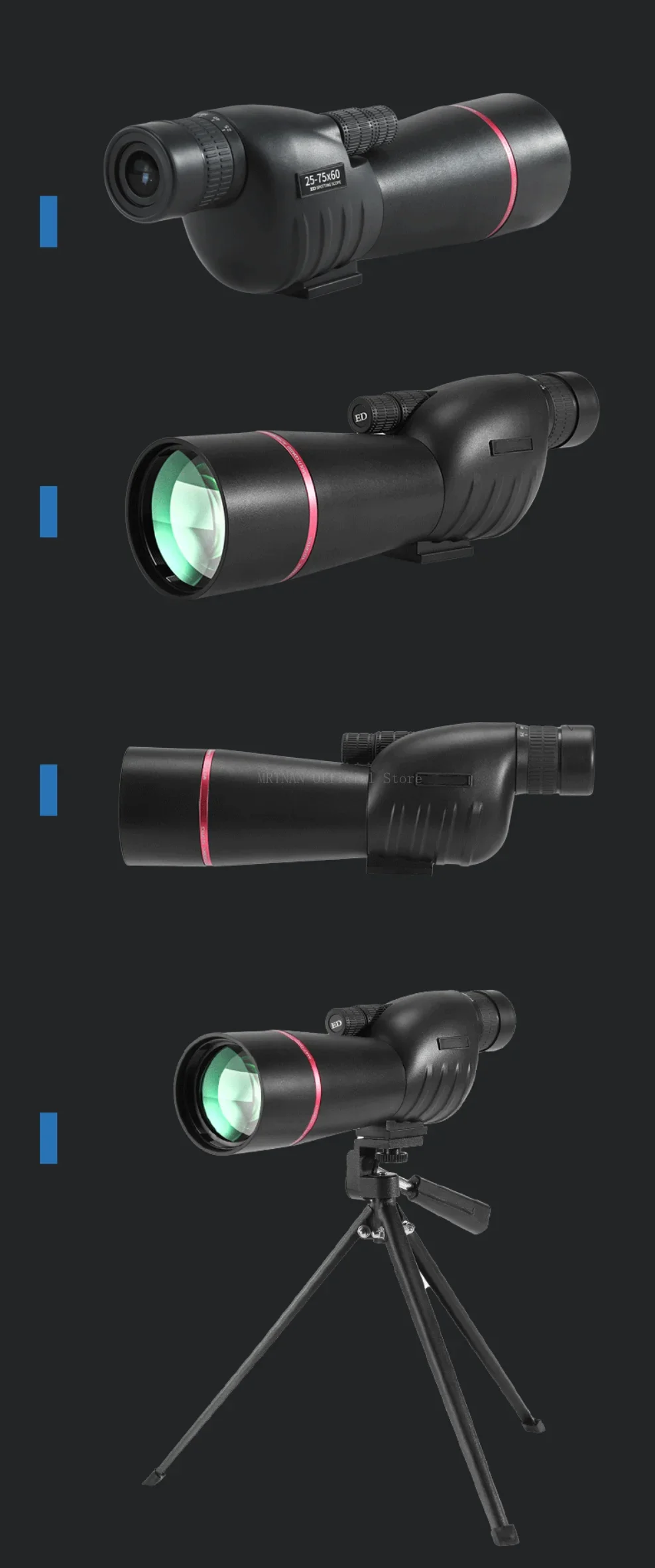 ● Zoom 25-75x: el telescopio 25-75x60 es fácil de enfocar y cambiar de aumento, fácil de configurar al mirar pájaros y paisajes. Un gran telescopio para principiantes y principiantes.