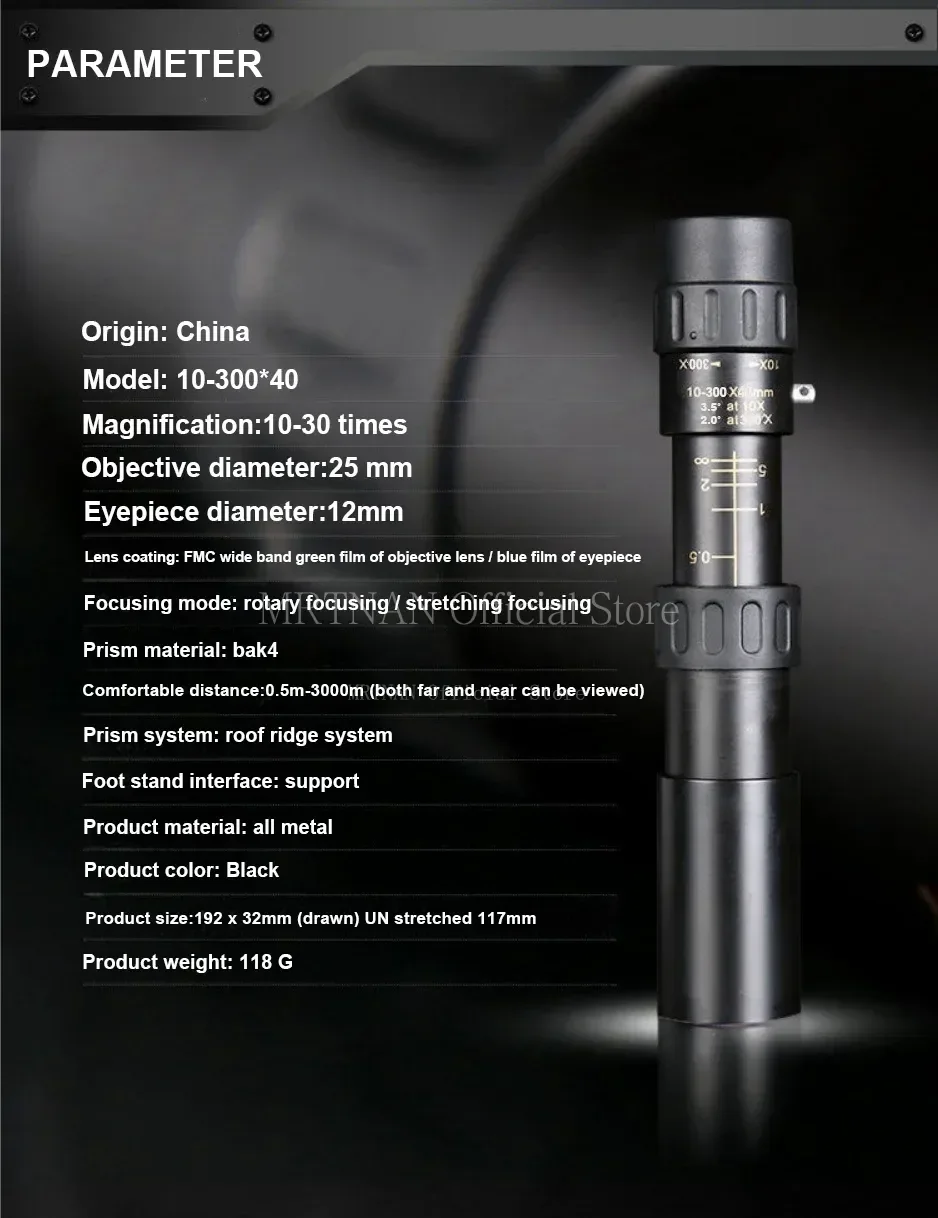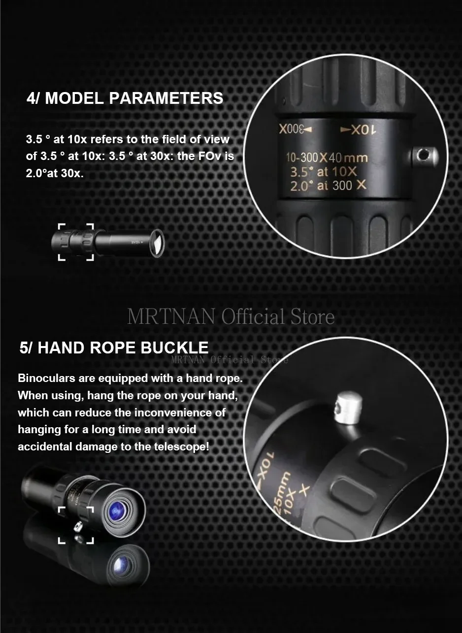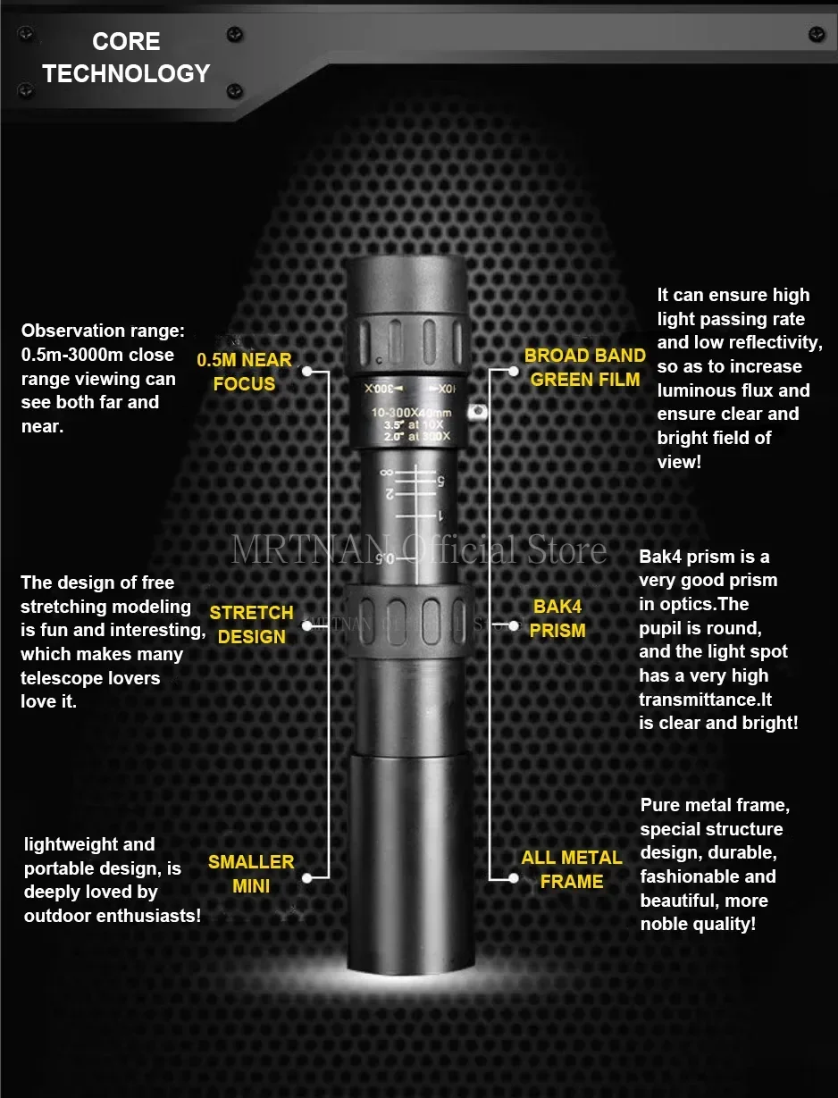 Telescopio con Zoom 10-300x40, binoculares portátiles HD fuertes, monocular profesional de largo alcance, visión nocturna baja para caza