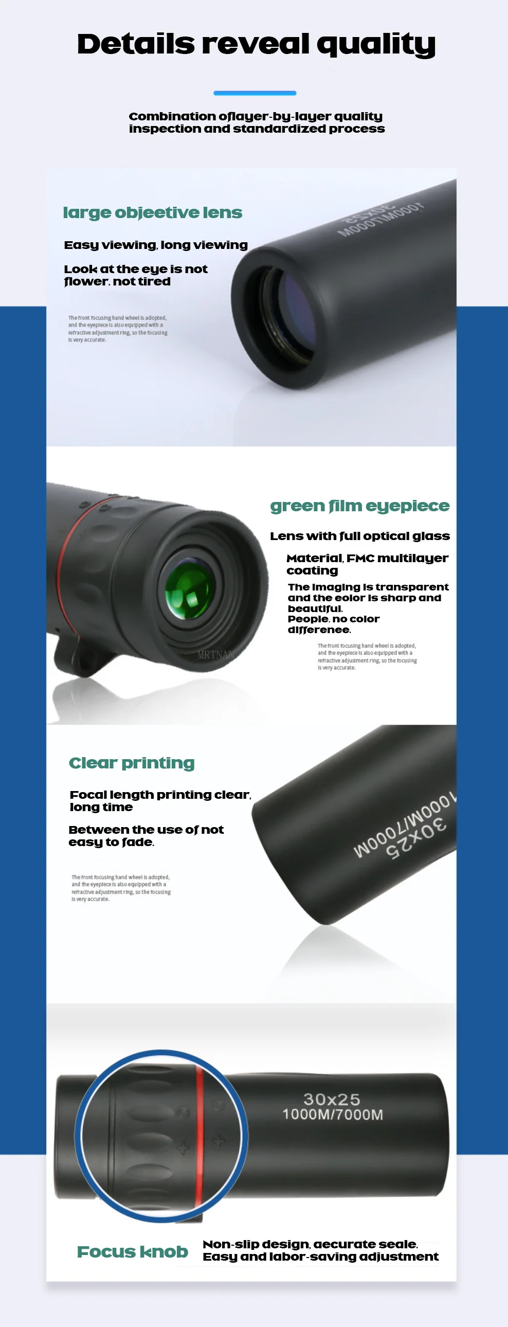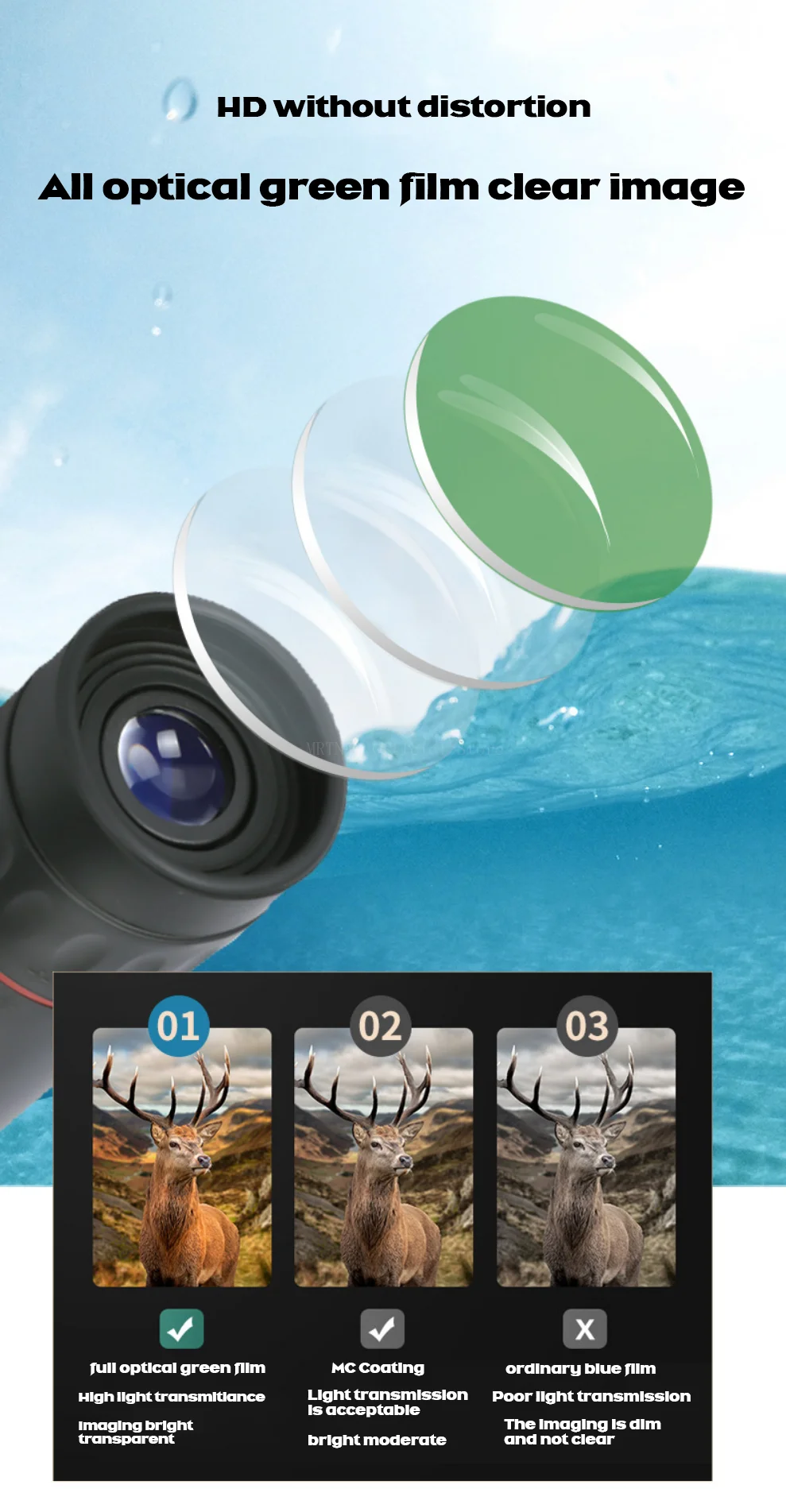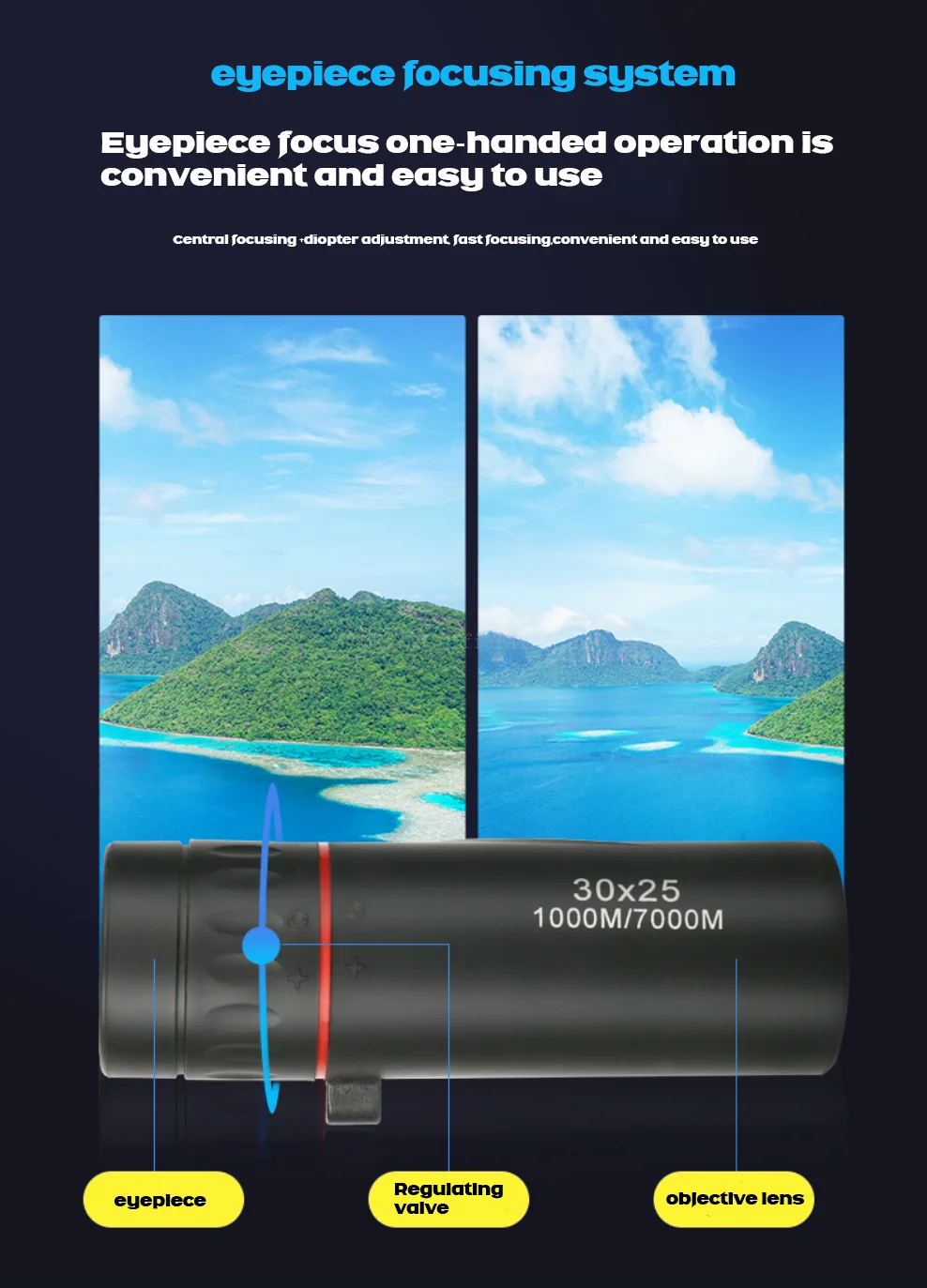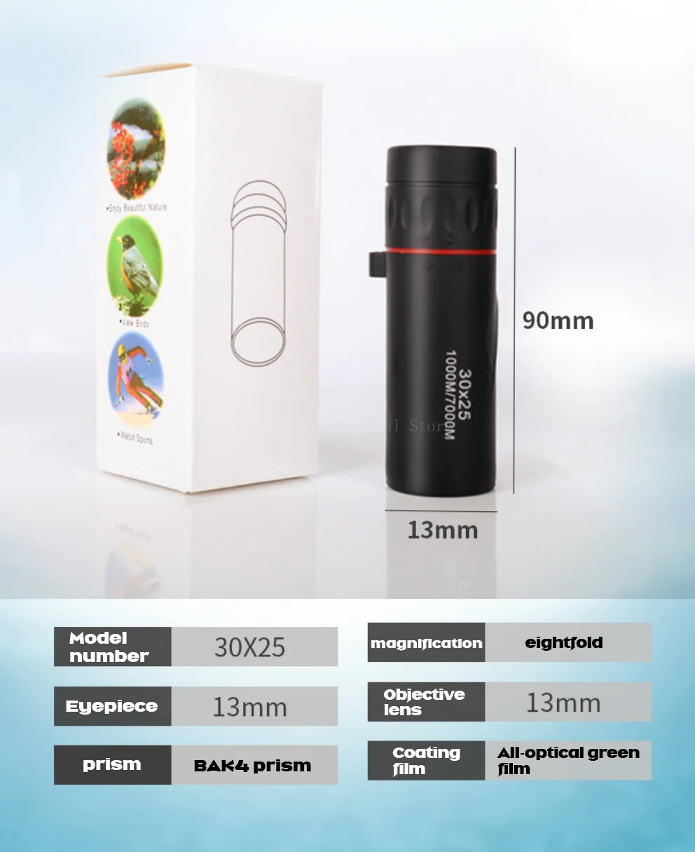 1.Este monocular ofrece un aumento de 8x y un diámetro de objetivo de 21 mm.