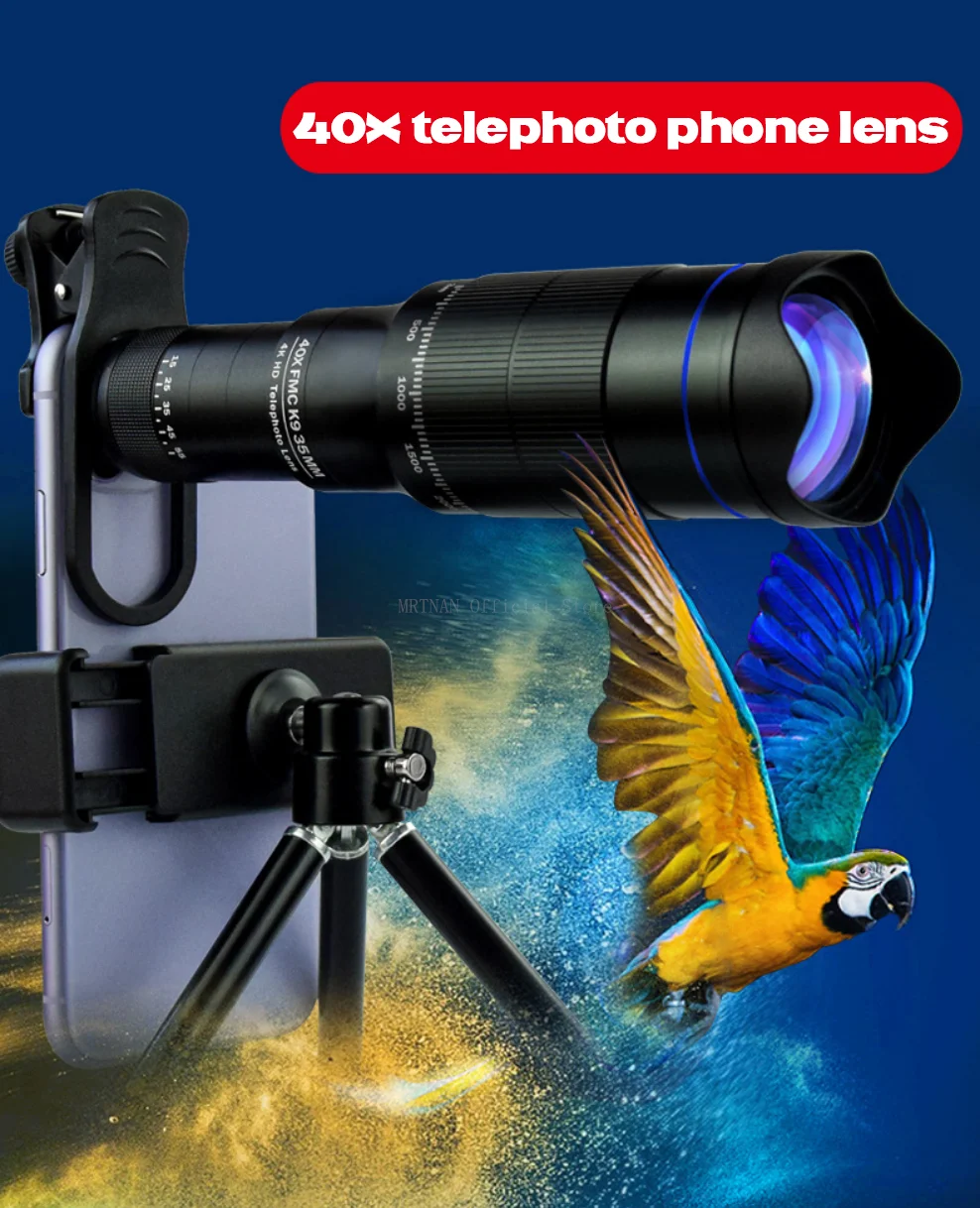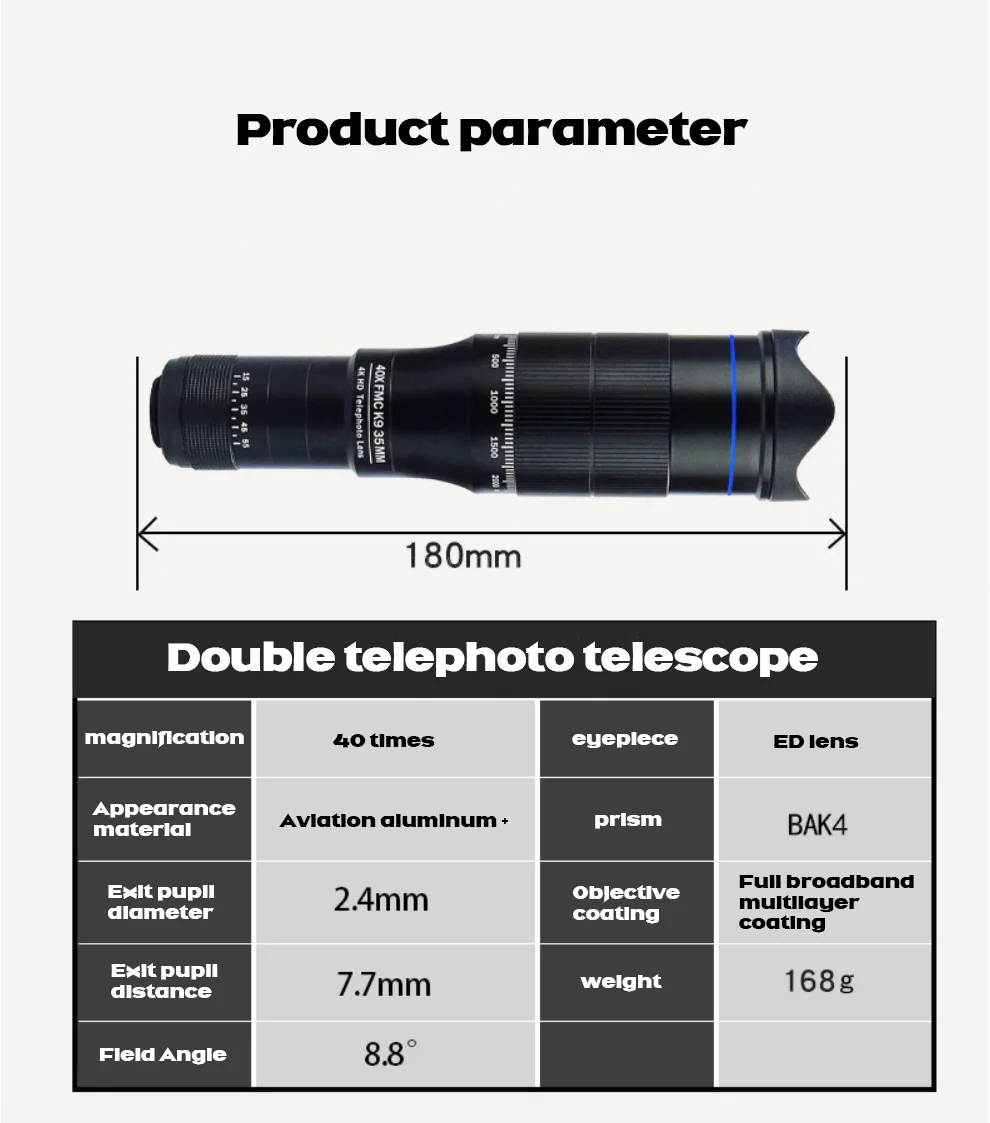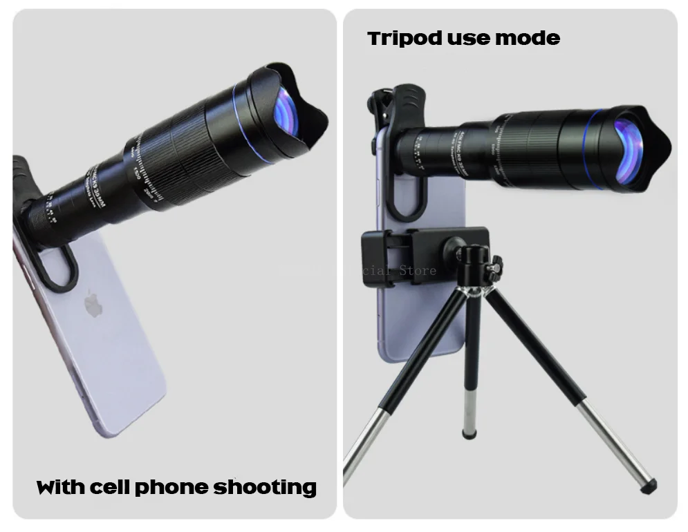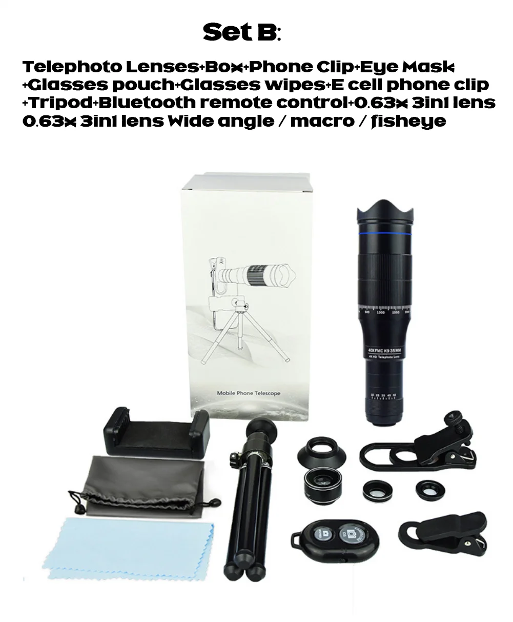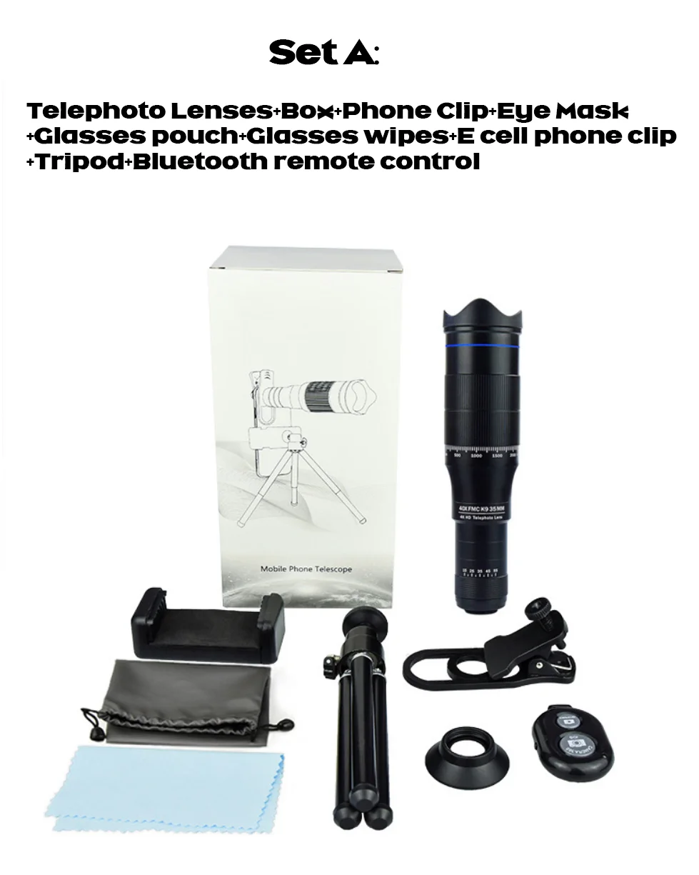 Teleobjetivos + caja + clip para teléfono + máscara para ojos + bolsa para gafas + toallitas para gafas + clip para teléfono móvil E + trípode + control remoto Bluetooth