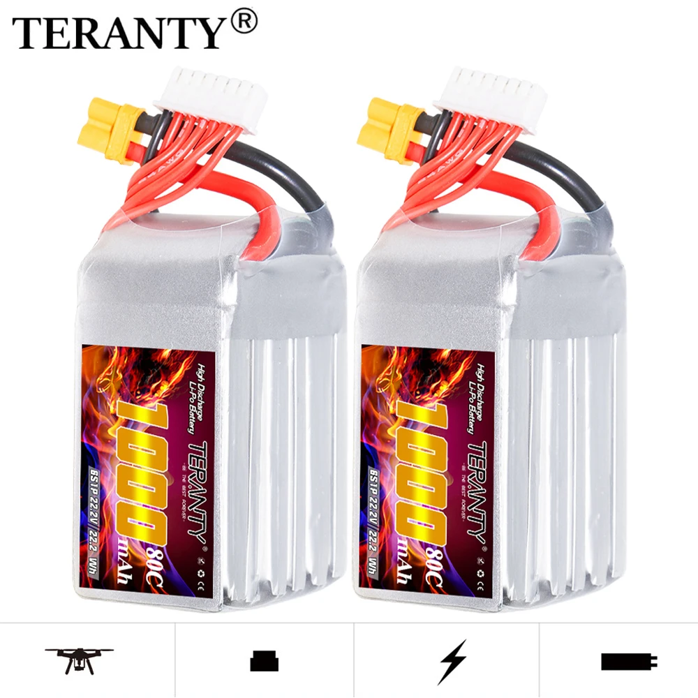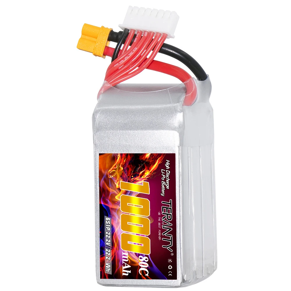 Specification:Brand: TERANTYVoltage: 22.2VCapacity: 1000mAhDischarge Rate: 80C Continual / 160C BurstConfiguration: 6S1PConnector Type: XT30PlugBalancer Connector Type: JST-XHLength: 65mmWidth: 30mmHeight: 45mmBattery Weight: 160g