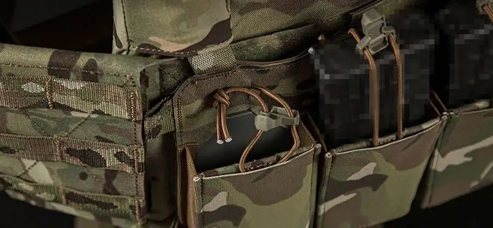 1 Equipado con una placa de bolsa para cargadores triple M4 de 5,56 con inserciones de plástico MAGs y un lazo elástico en el frente para guardar pequeños kits tácticos.