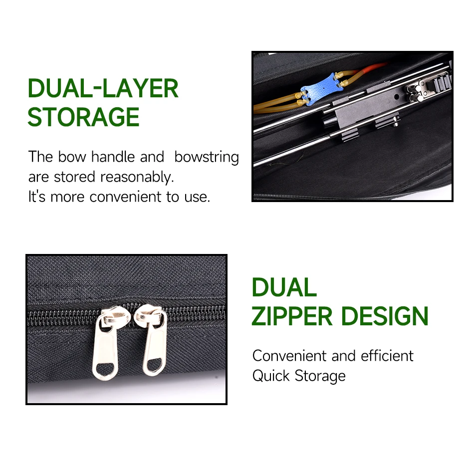 Características del producto: 1.La bolsa con lazo adopta un método de transporte de doble propósito, que se puede llevar en la mano o en la espalda. 2.La bolsa puede acomodar tirachinas largas y arcos y flechas. 3. El material está hecho de cuero y nailon, que es resistente y duradero.