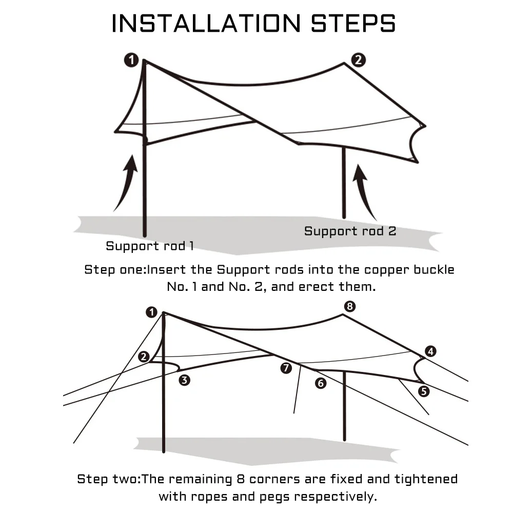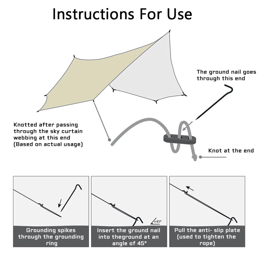 Primero despliegue la lona en el suelo, excepto por las dos esquinas del poste, ATE la cuerda a las otras esquinas primero. Luego coloque la abrazadera y sujete la cuerda de la abrazadera. Luego ajuste las otras 6 esquinas de la cuerda.