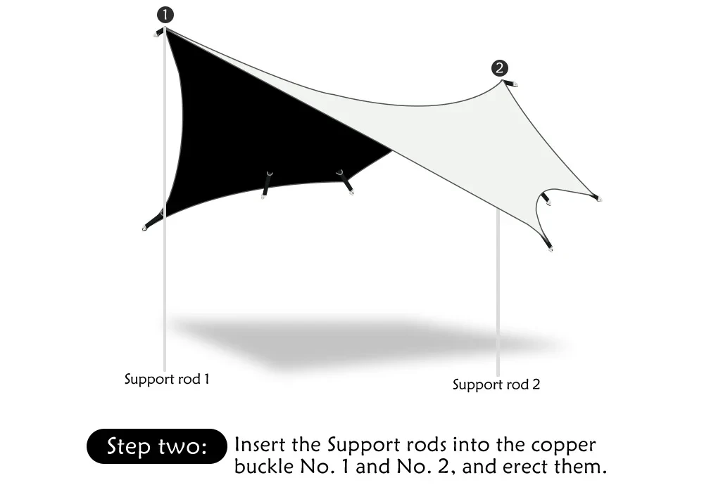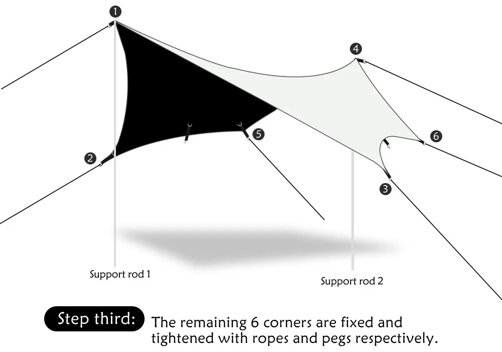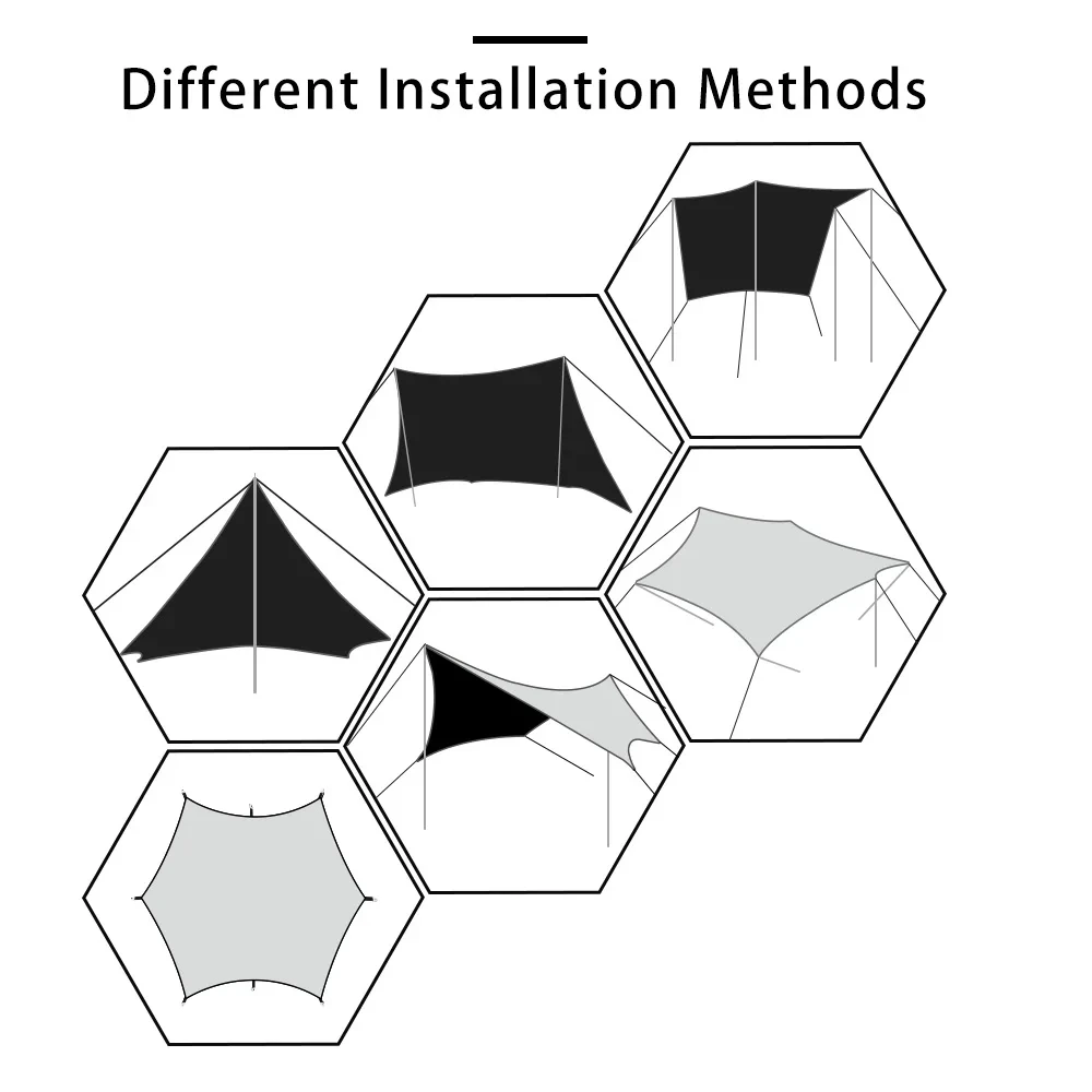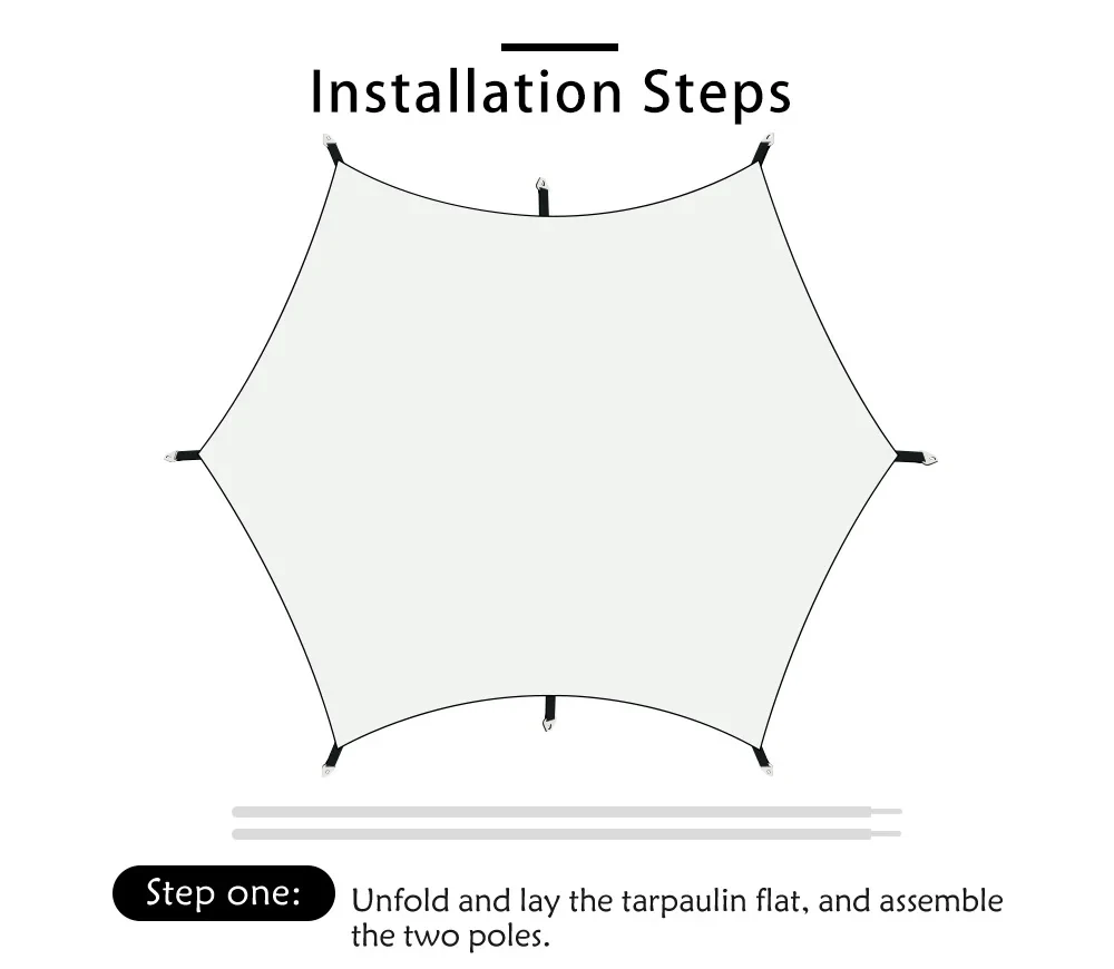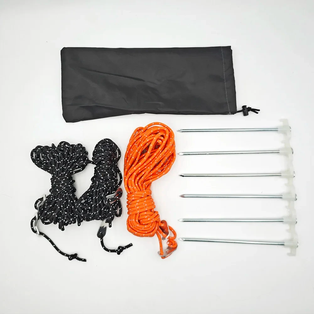 Juego de lonas: 1 lona/6 Cuerdas/6 clavijas/1 par de postes de 2,4 m/1 bolsa de almacenamiento