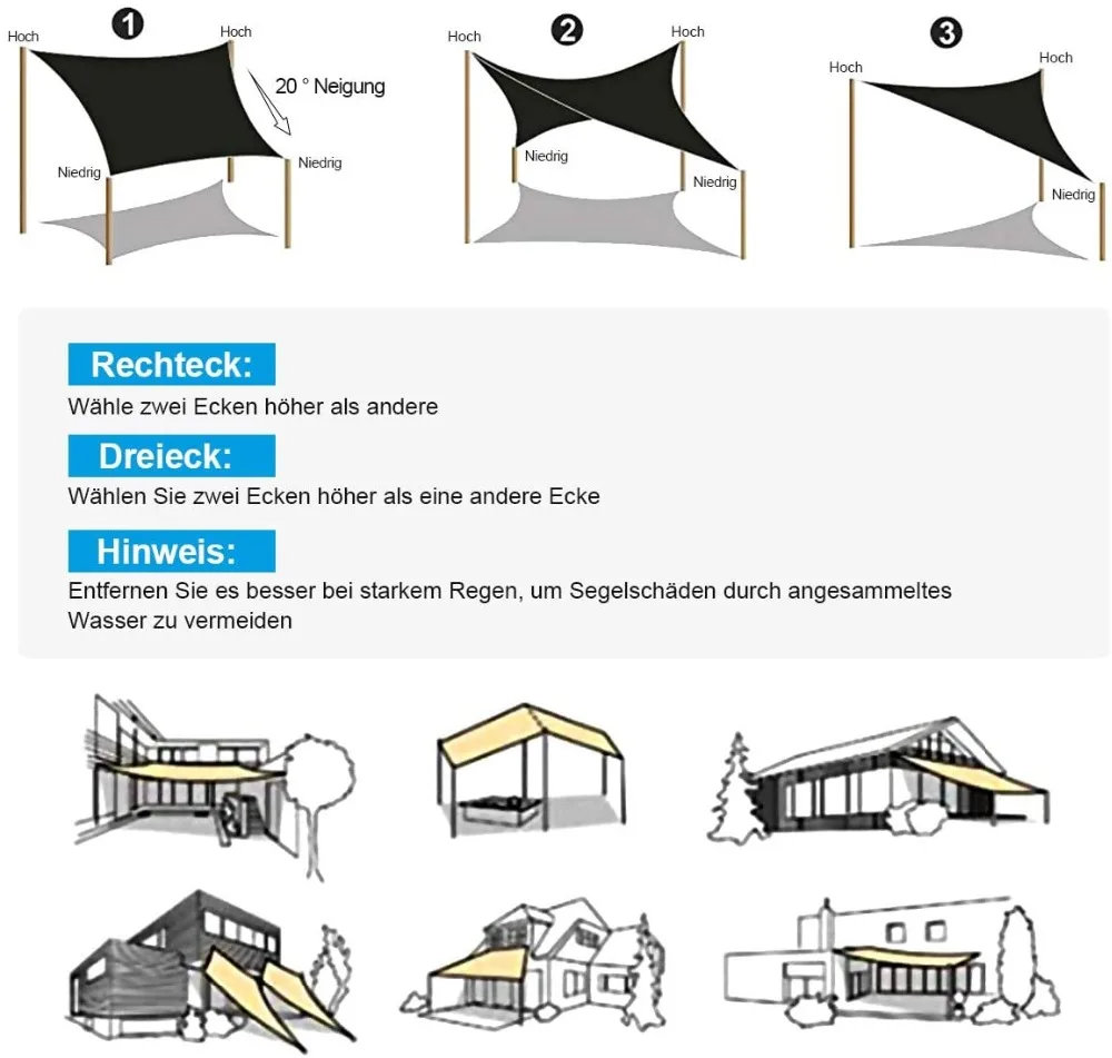 --- La vela del sol tiene un anillo en D y un cordón de viento, haciendo que sea fácil conectar casas/árboles/otros edificios.