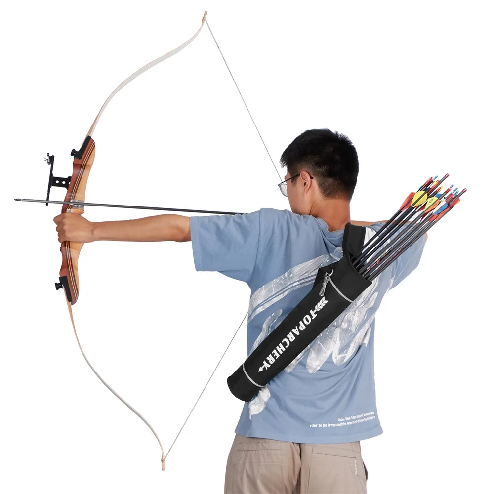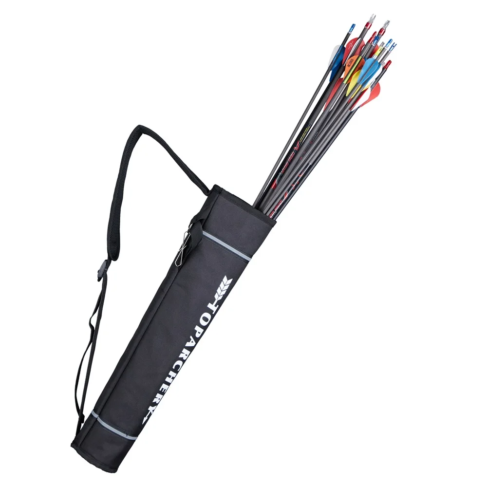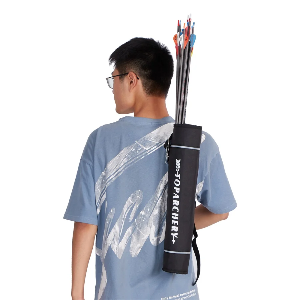 2. El carcaj mide 19 ''de largo, 3,5'' de diámetro inferior y 4 ''de diámetro de apertura, que puede acomodar 20-30 flechas, recomendamos sostener flechas de menos de 30''; las correas de los hombros son ajustables de 15 "a 36" para adaptarse a jóvenes y adultos.