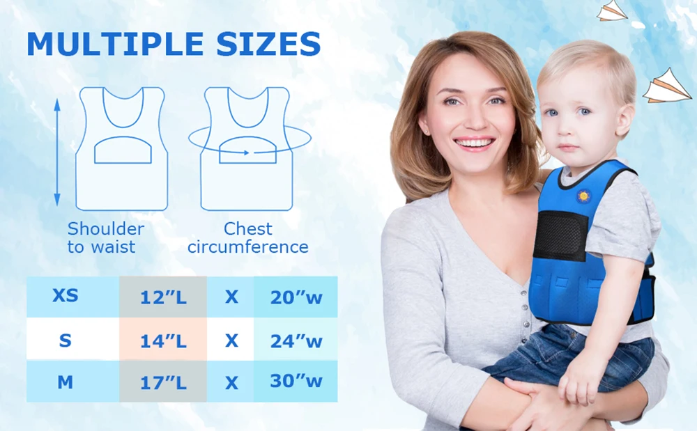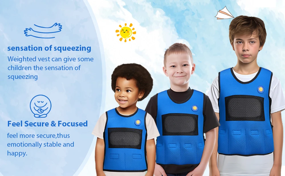 1. El Chaleco de compresión permite a los niños sentir una presión profunda en todo el torso y la espalda, simulando un cálido abrazo. El Chaleco con peso puede dar a algunos niños la sensación de apretar, haciéndolos sentir más seguros y, por lo tanto, emocionalmente estables