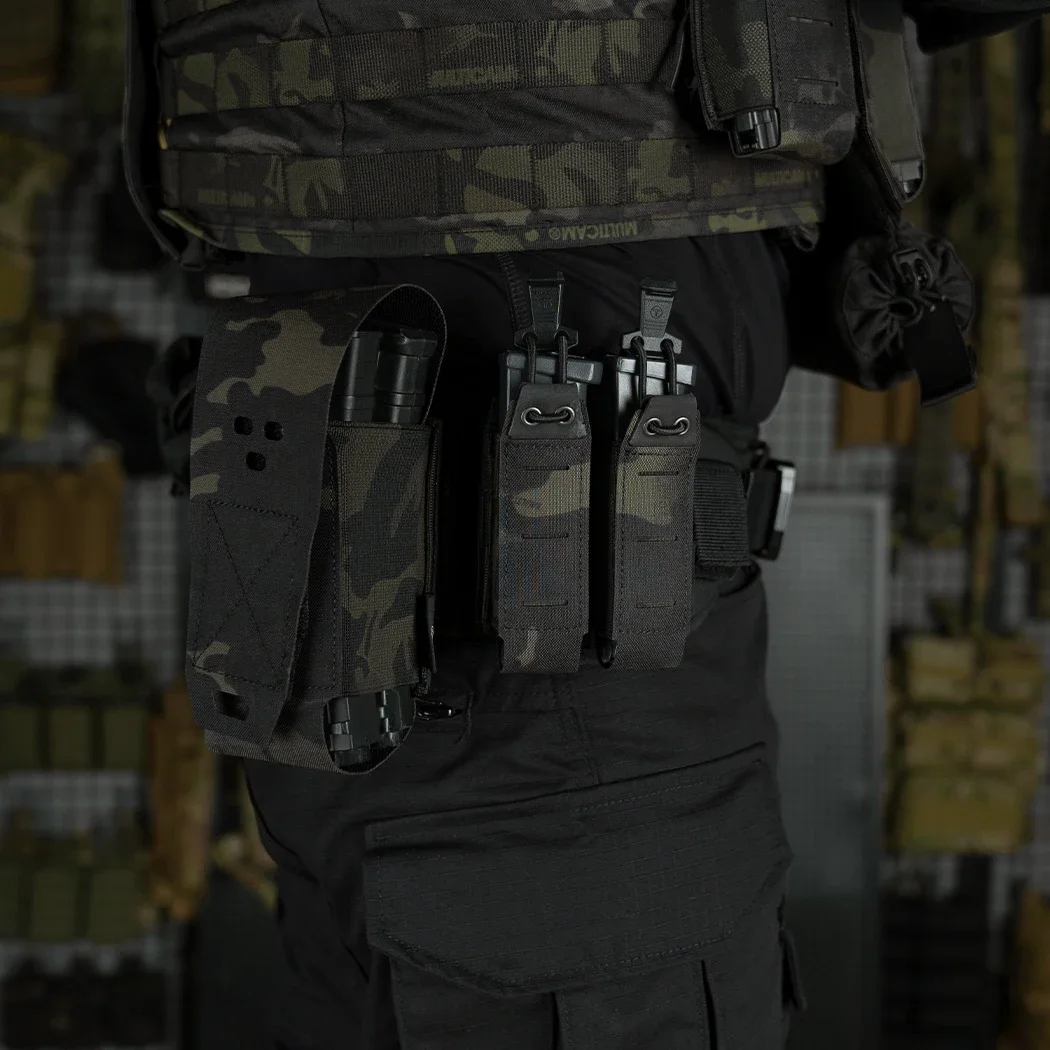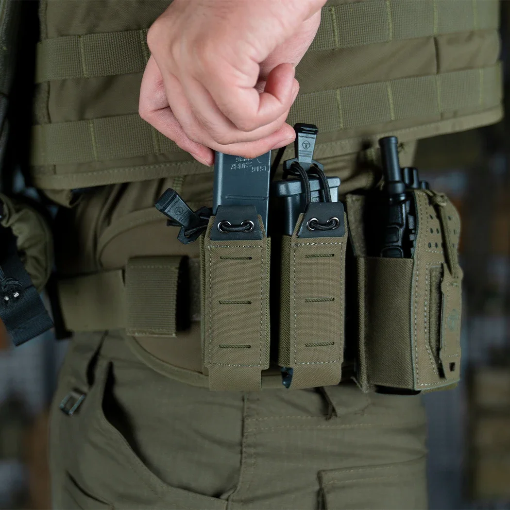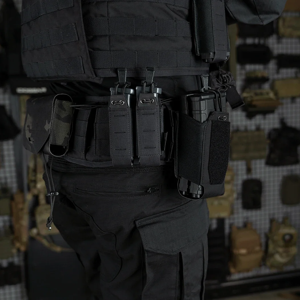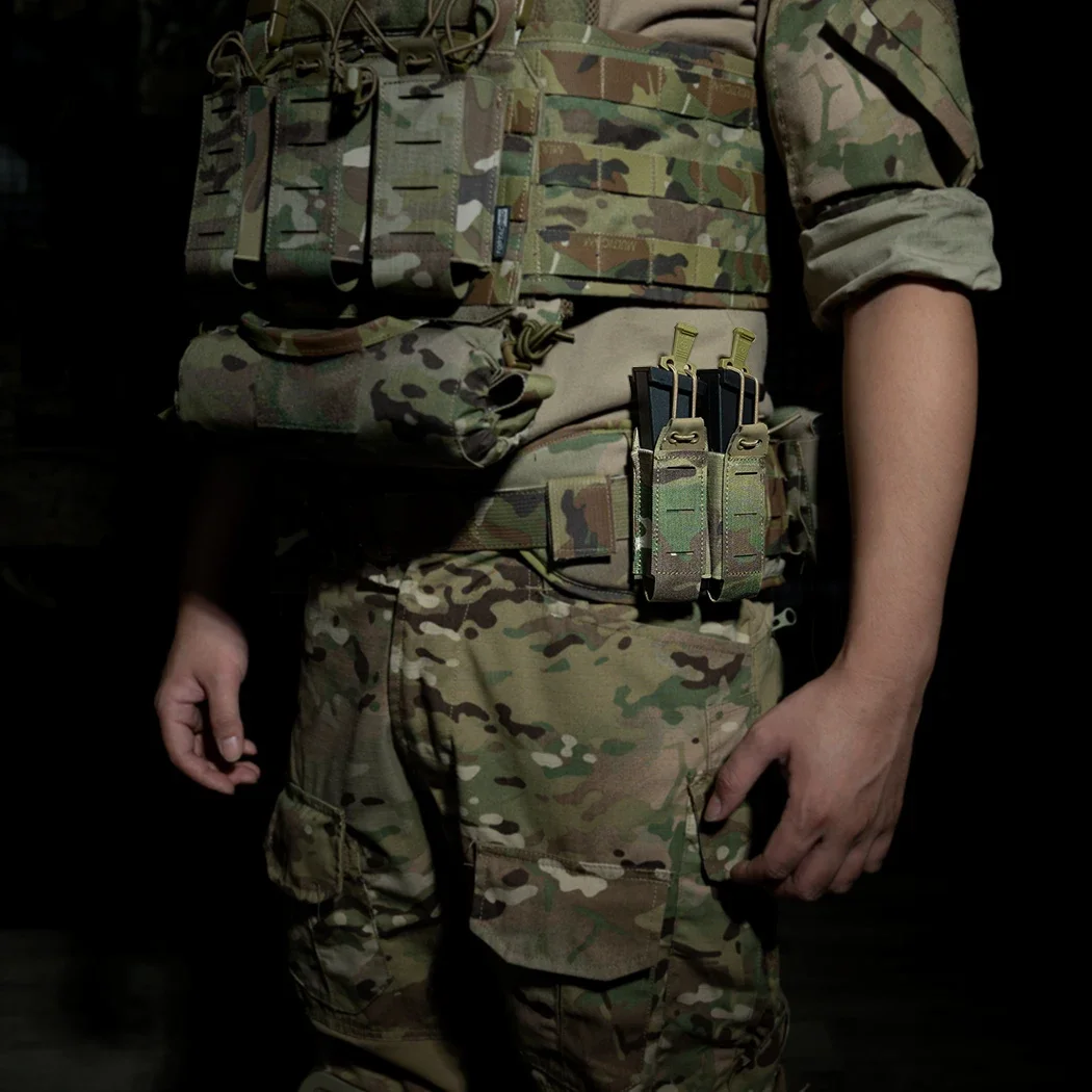 Fabricado con nailon + fibra de carbono de alta calidad, ligero y duradero.Parte superior abierta, dibujo rápidoSistema Molle, se puede acoplar a cualquier chaleco táctico o aparejo de pecho.Bucle interior, antideslizante, mantenga el artículo interior firmemente