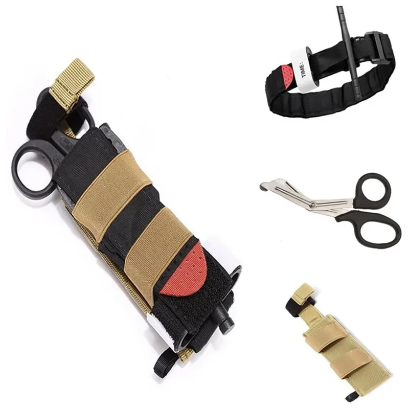 Torniquete táctico EMT de supervivencia médica, tijeras de primeros auxilios para traumatismos, vendaje, tijeras, bolsa Molle para acampar, operación con una sola mano