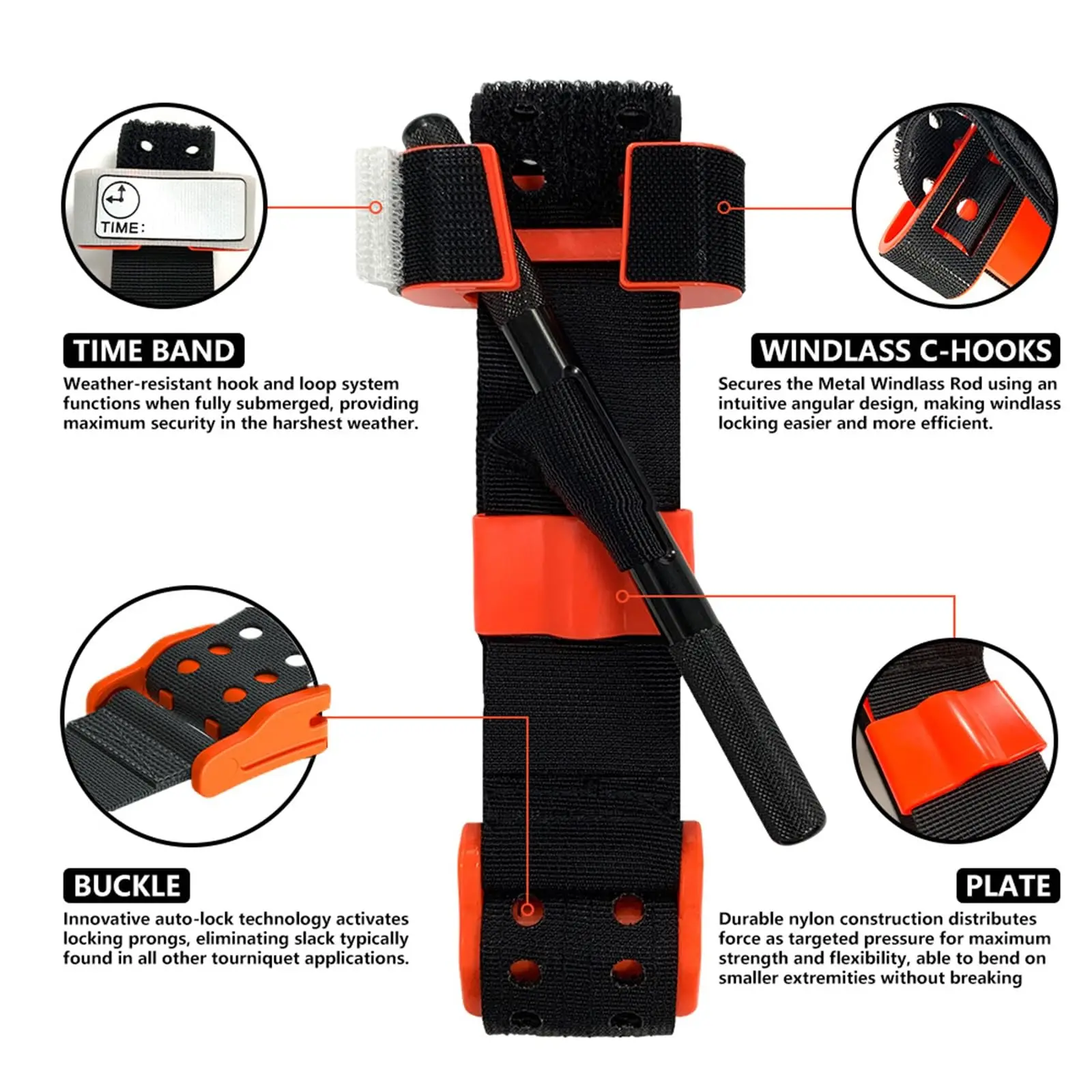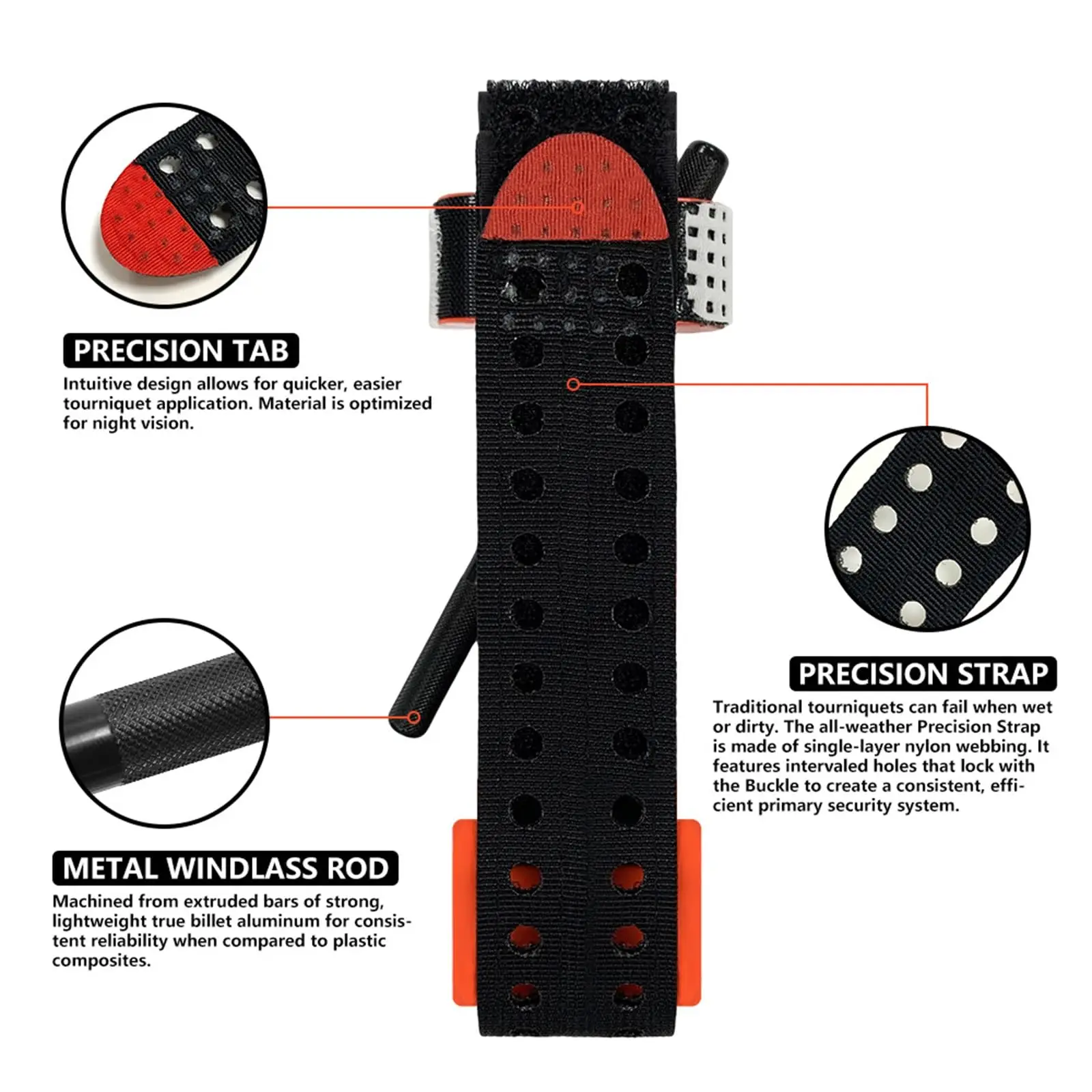 ● Cosido en la banda de compresión Performance debajo del molinete.La cuña contrastante ofrece una confirmación visual que ha eliminado todo el exceso de holgura de la banda.Este es un paso crítico para una aplicación adecuada del torniquete y da como resultado menos rotaciones del molinete necesarias para alcanzar la oclusión.