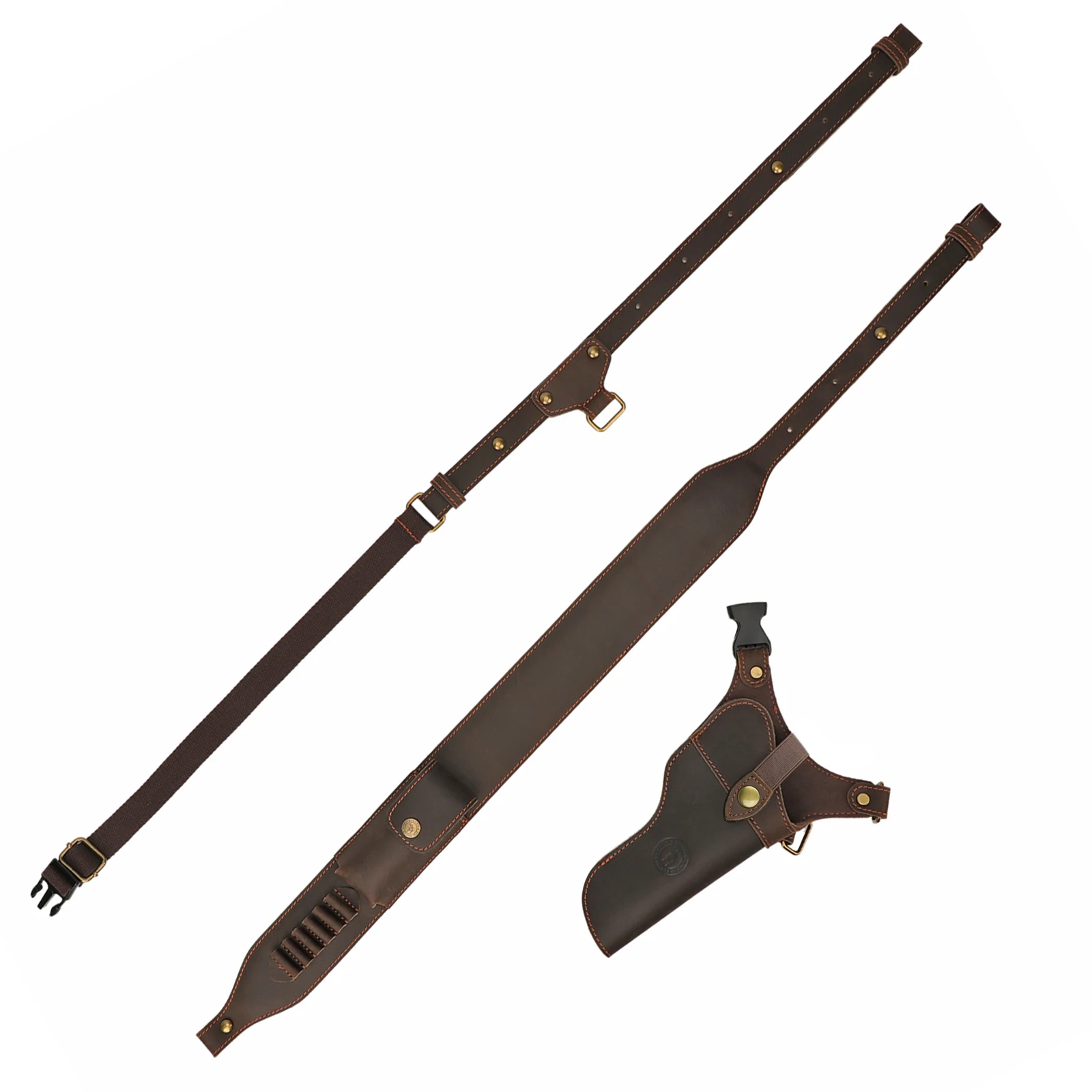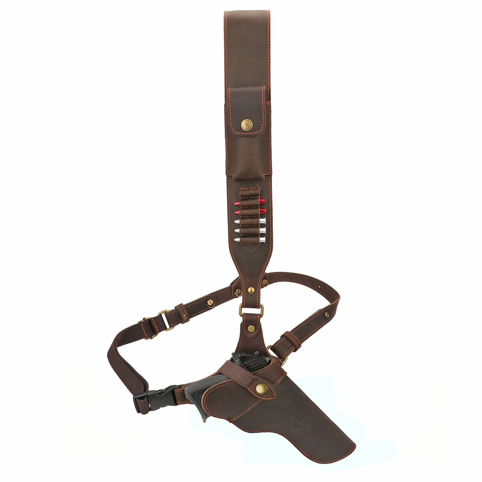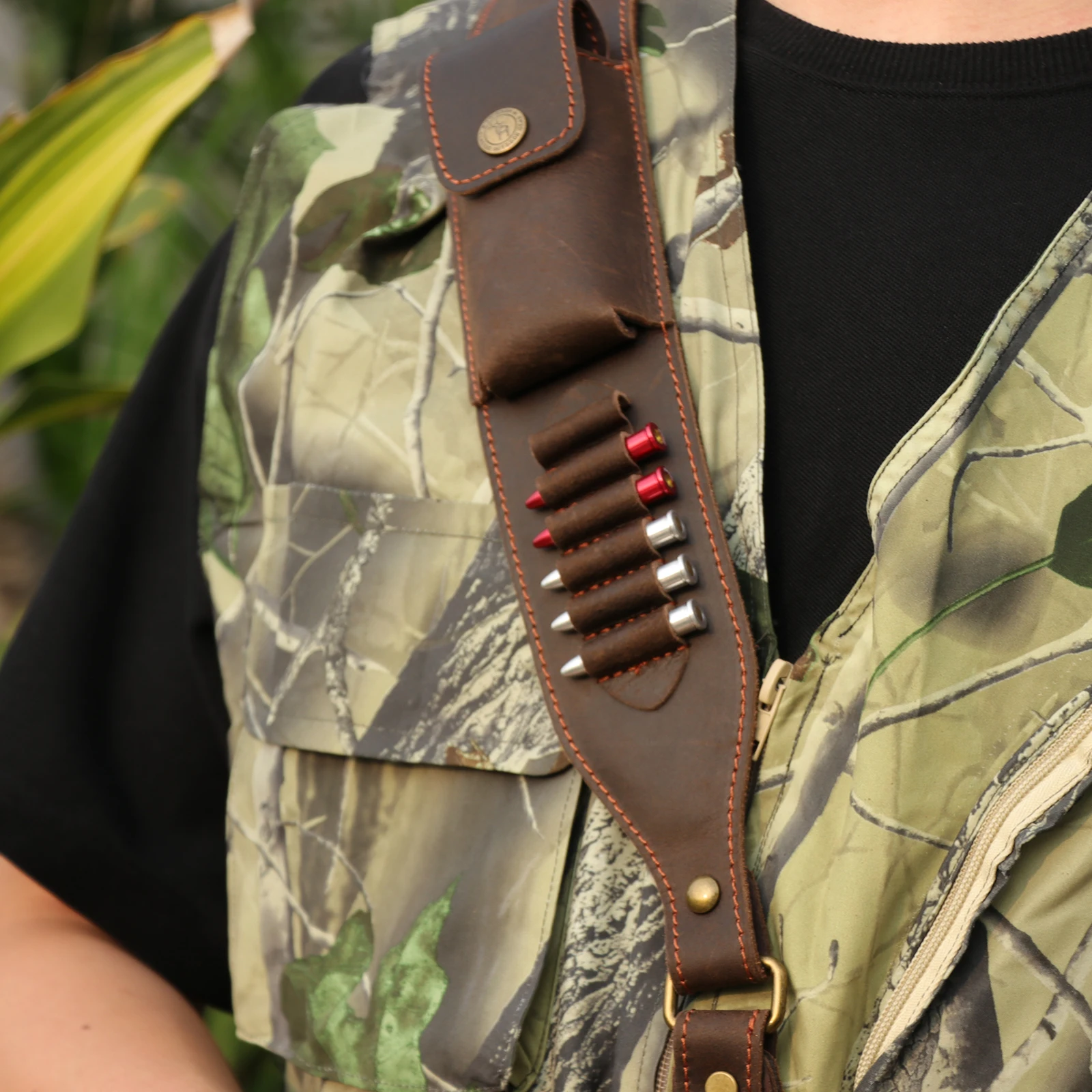 -Sobre el hombro acolchado en el punto posterior y correas lo suficientemente largas con 5 soportes de cartuchos para ajustar, se adapta a cartuchos de 38/9mm/357.