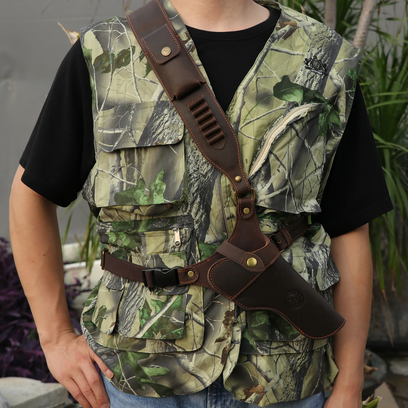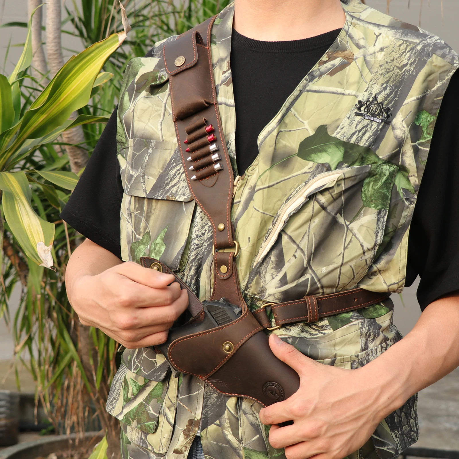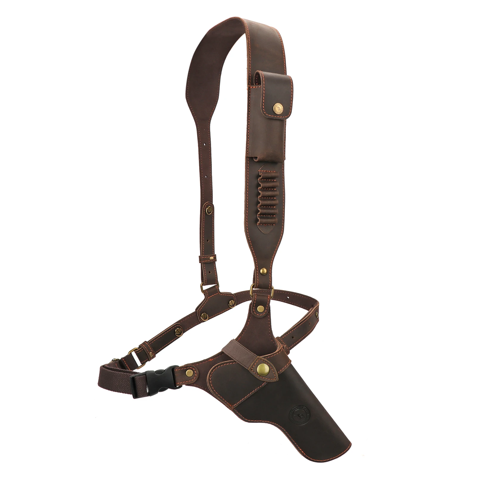 -Sobre el hombro acolchado en el punto posterior y correas lo suficientemente largas con 5 soportes de cartuchos para ajustar, se adapta a cartuchos de 38/9mm/357.