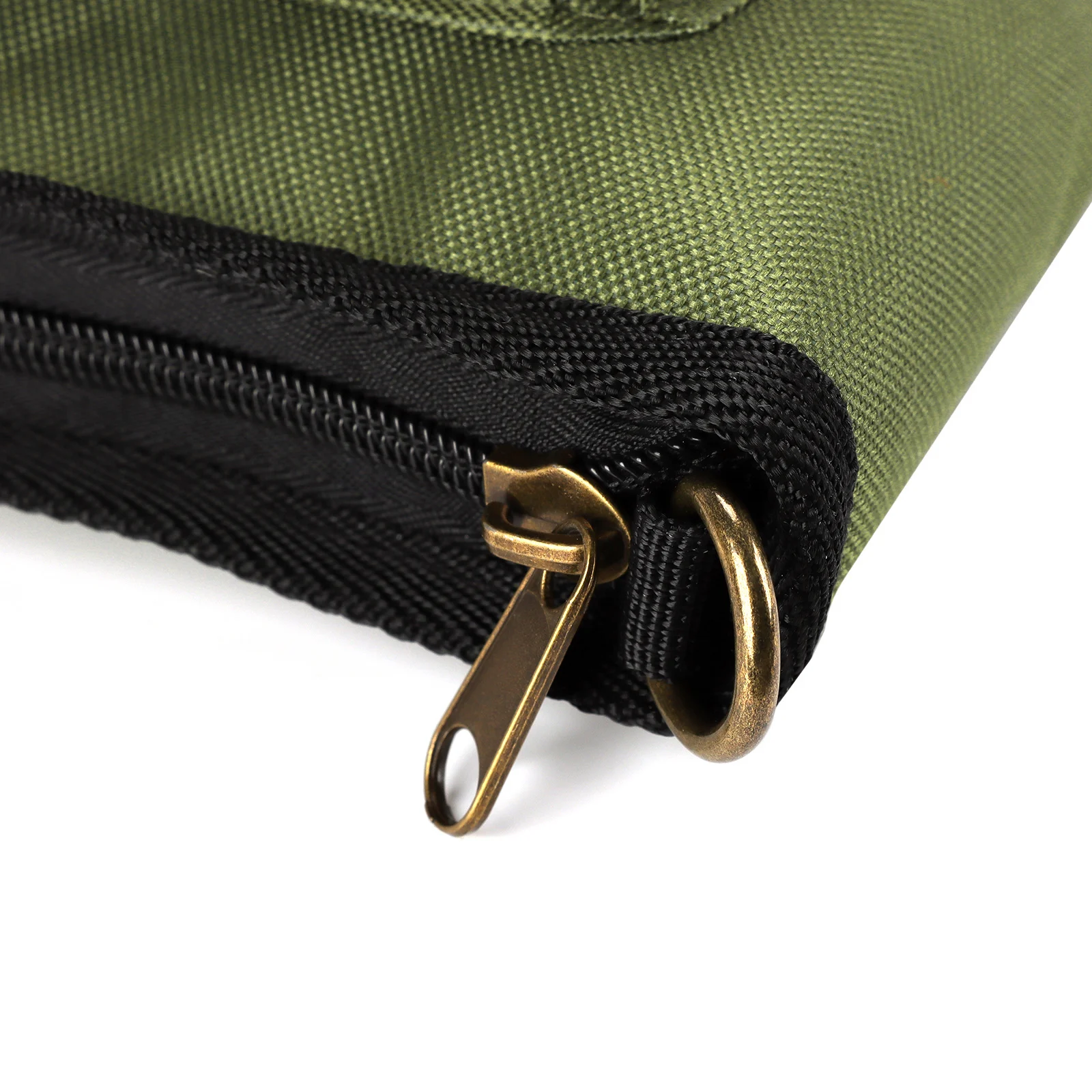 - Cremallera resistente de longitud completa, diseño de bucle para colgar, anillo en D para bloquear