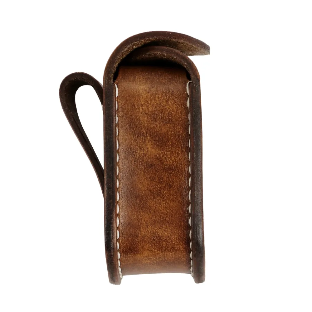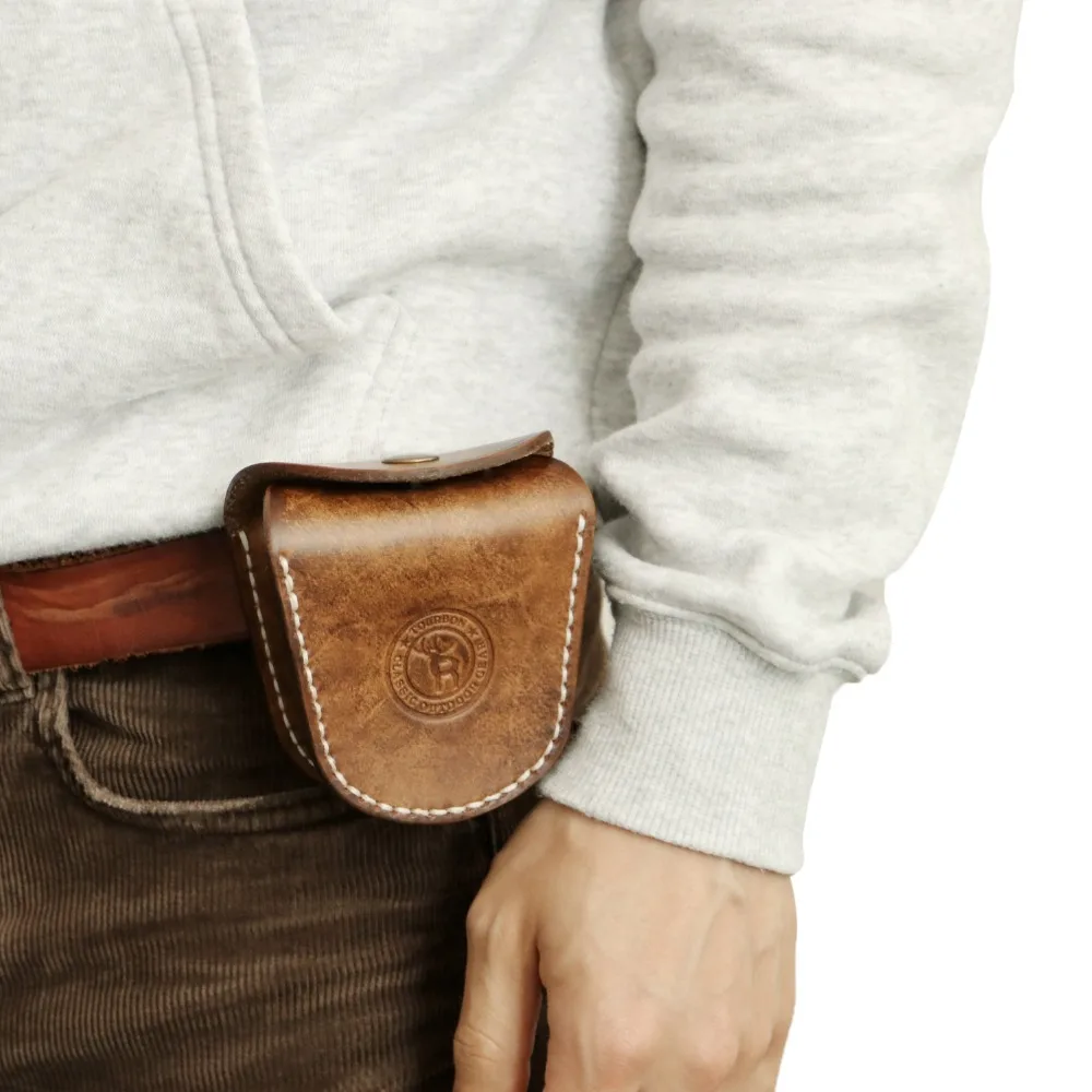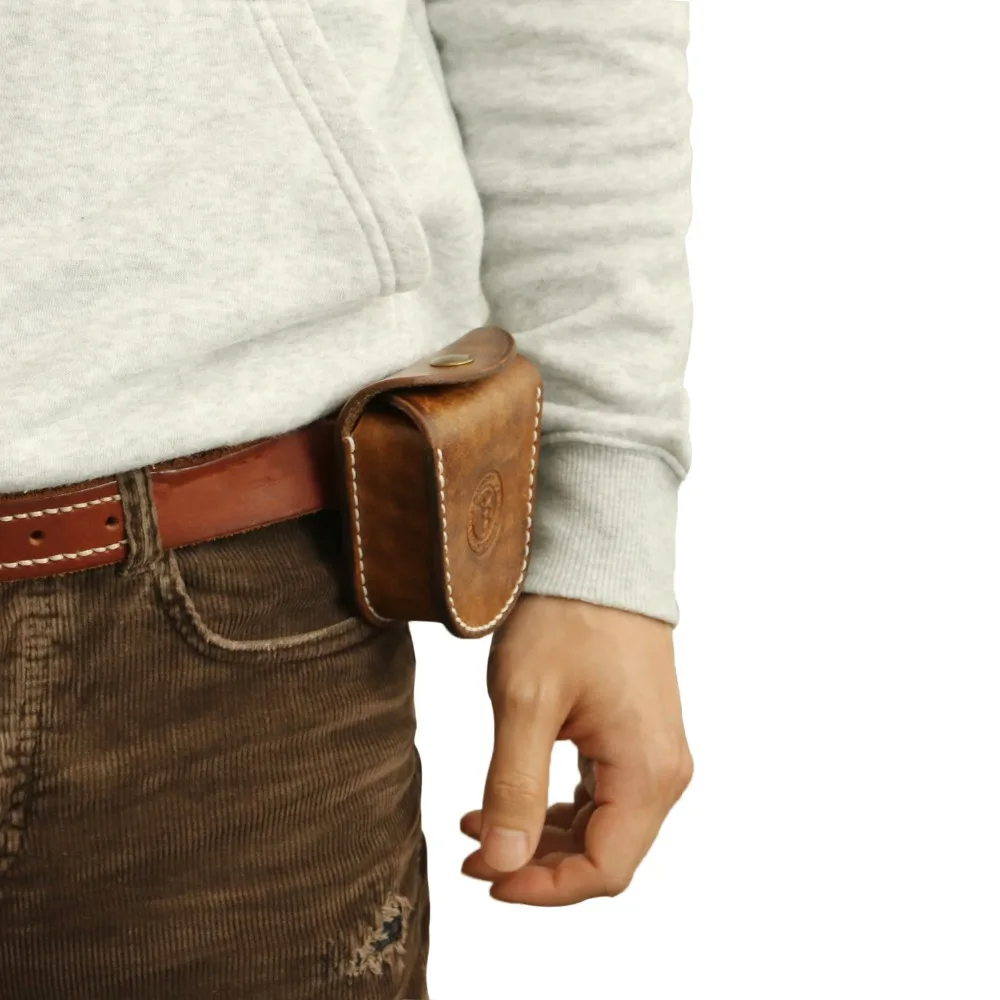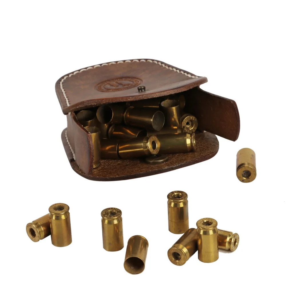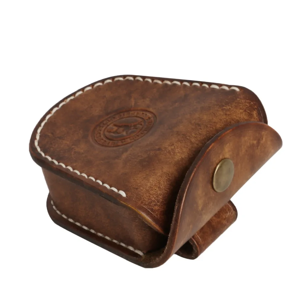 -Hecho de cuero grueso de calidad con costuras sólidas a mano-El Cierre del botón es muy fuerte y fácil de abrir o cerrar rápidamente.-Puede sujetar el cinturón a través del lazo en la parte posterior para llevarlo, así como deslizarlo en su bolsillo delantero o trasero-Sostiene. 22 , 25 , .38 , .45 , 1/2 "bolas, 3/8" bolas, 5/16 "bolas, perdigones de rifle de aire, etc.