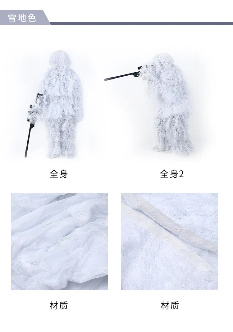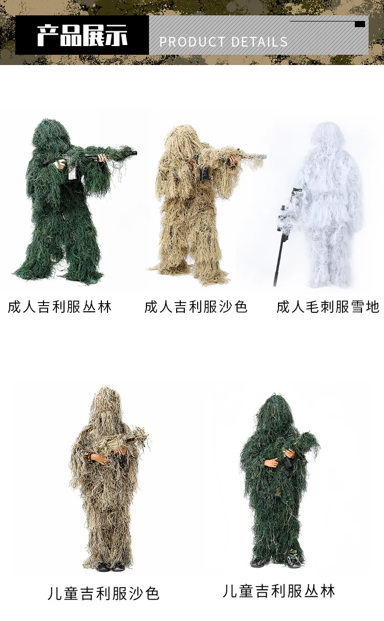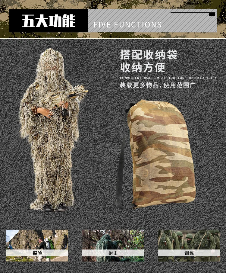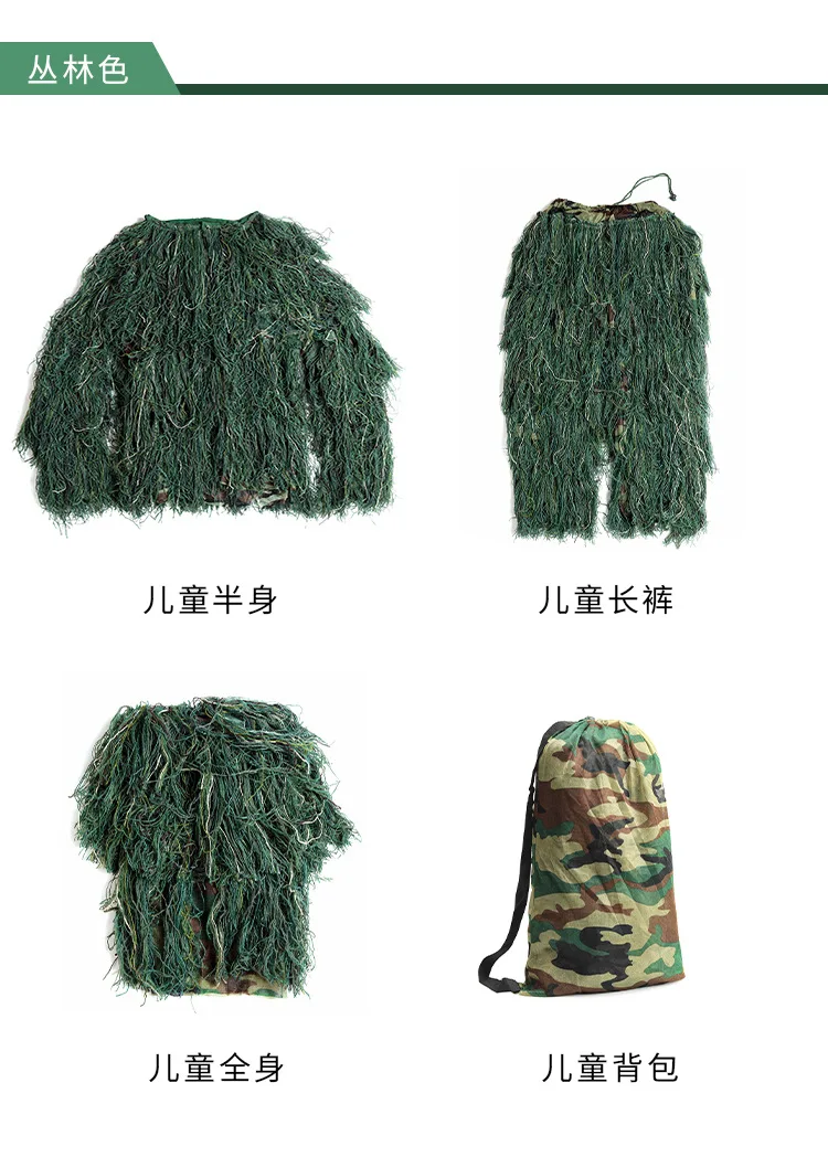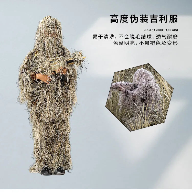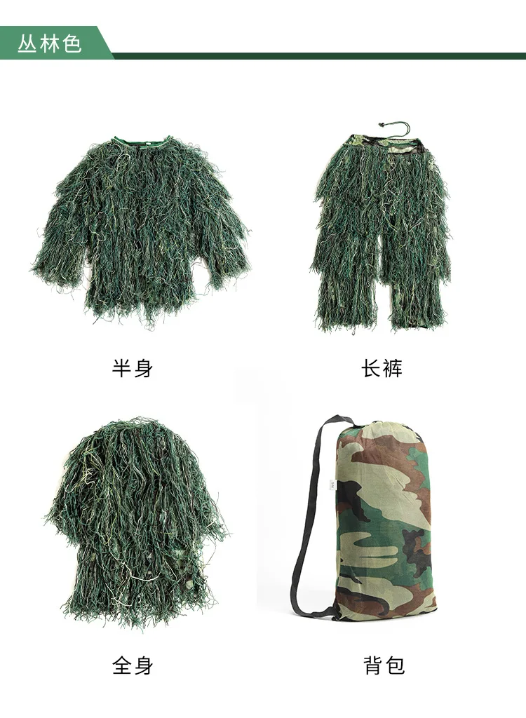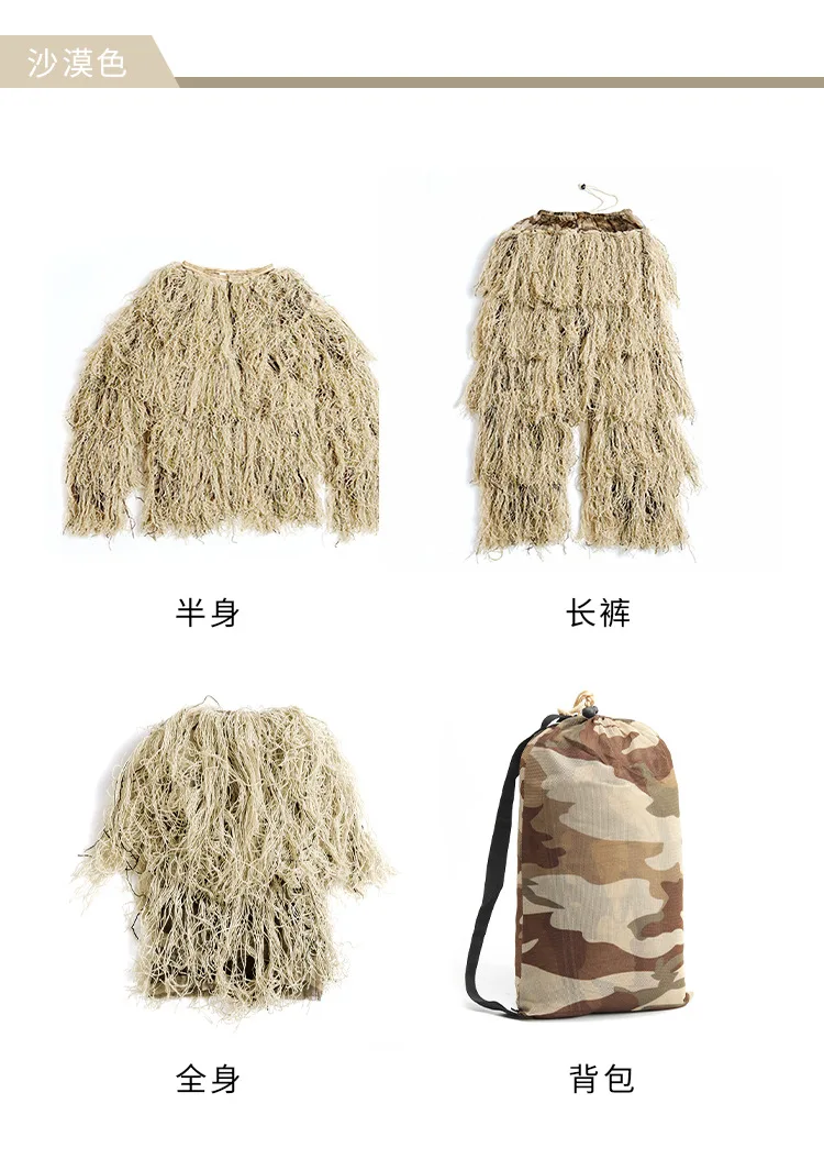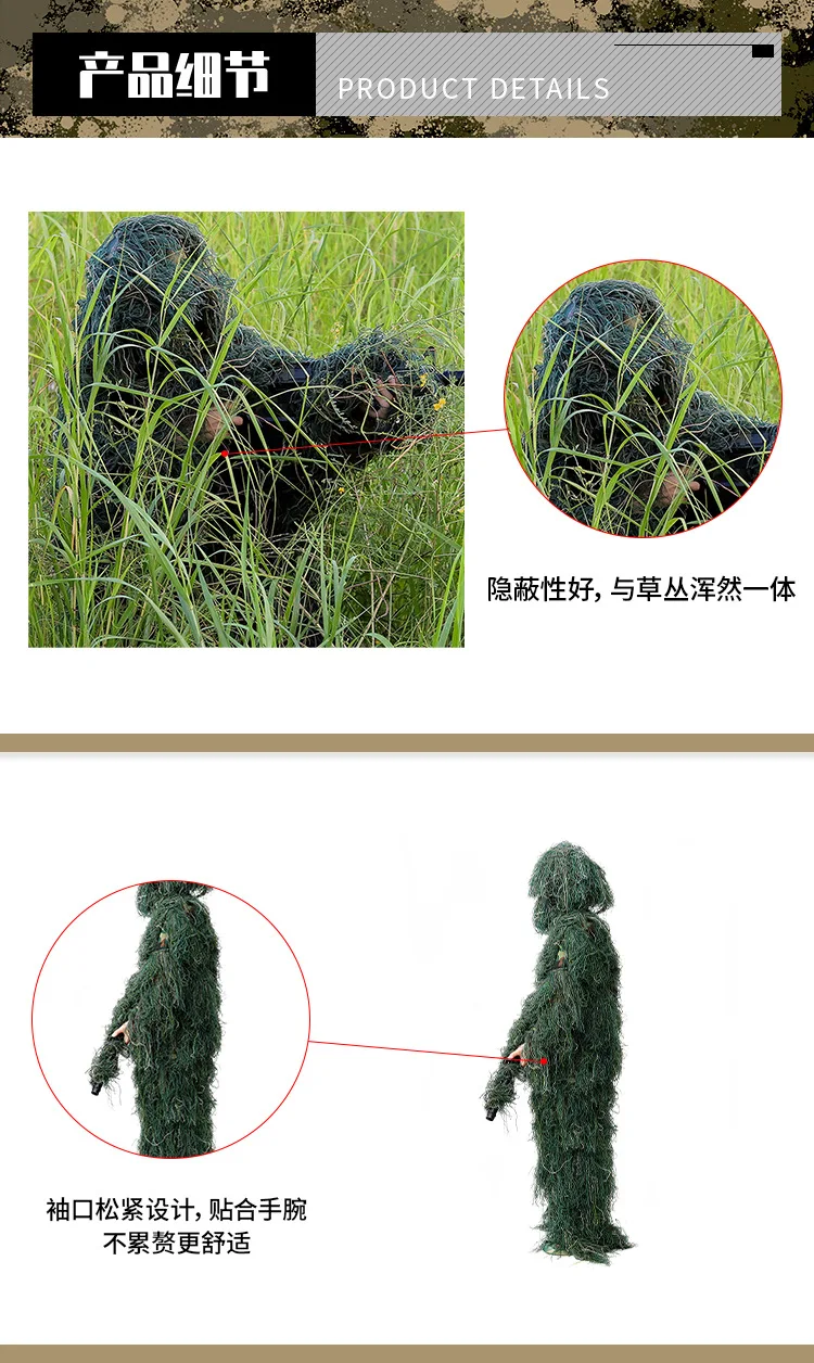 7. Traje Ghillie de camuflaje con materiales de cáñamo de alta calidad, hecho de tela, fácil de limpiar, no arrojará el repollo, transpirable, brillante y de color puro estable, no se desvanece ni se deforma.