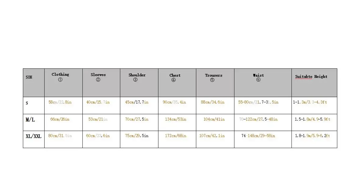 El paquete incluye: 1 pieza superior, 1 pieza pantalón, 1 pieza sombrero, 1 pieza bolsa, 2 piezas (1 par) guantes, un total de 6 piezas