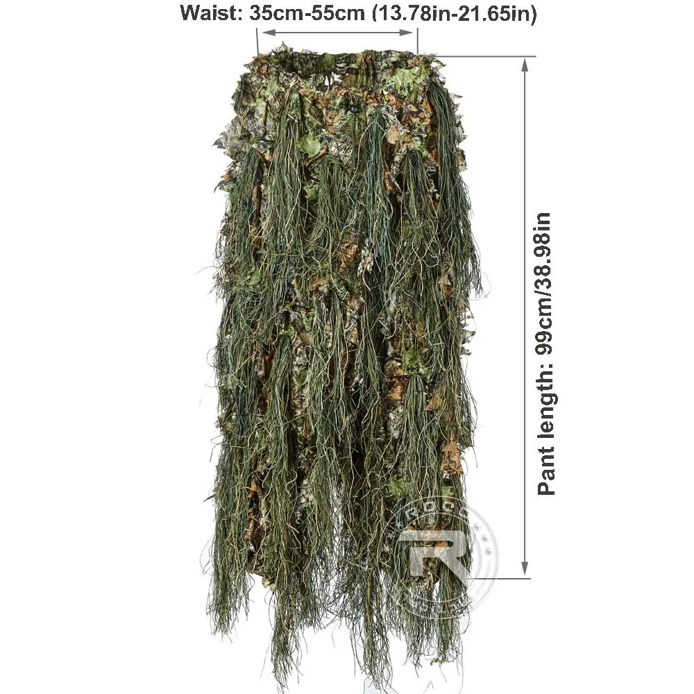 Tamaño: longitud de la chaqueta Ghillie 99cm, longitud de la manga 63cm, 69cm longitud del pantalón, cintura del pantalón 35-55cm